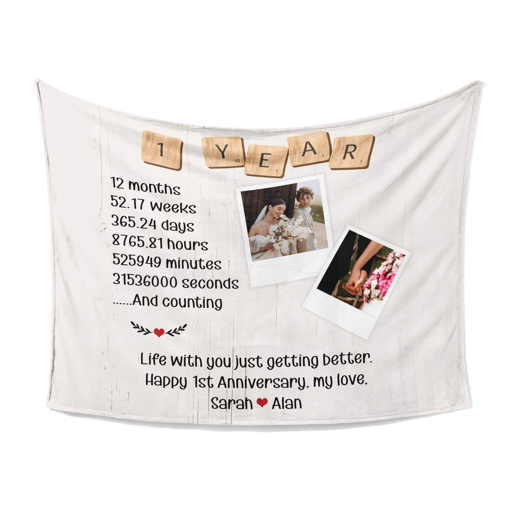 Cozy up to the warmth of memories with our 1 Year Anniversary Custom Photo Blanket—a customizable and sentimental gift that celebrates a year of love and growth. This blanket is adorned with two wedding pictures, elegantly marking the beginning of your shared adventure. The custom touch adds a personal dimension, creating a visually striking and comforting blanket perfect for chilly evenings or as a decorative throw. Embrace the warmth of your love with this exceptional custom blanket —a tangible representation of the first chapter of your beautiful journey together.