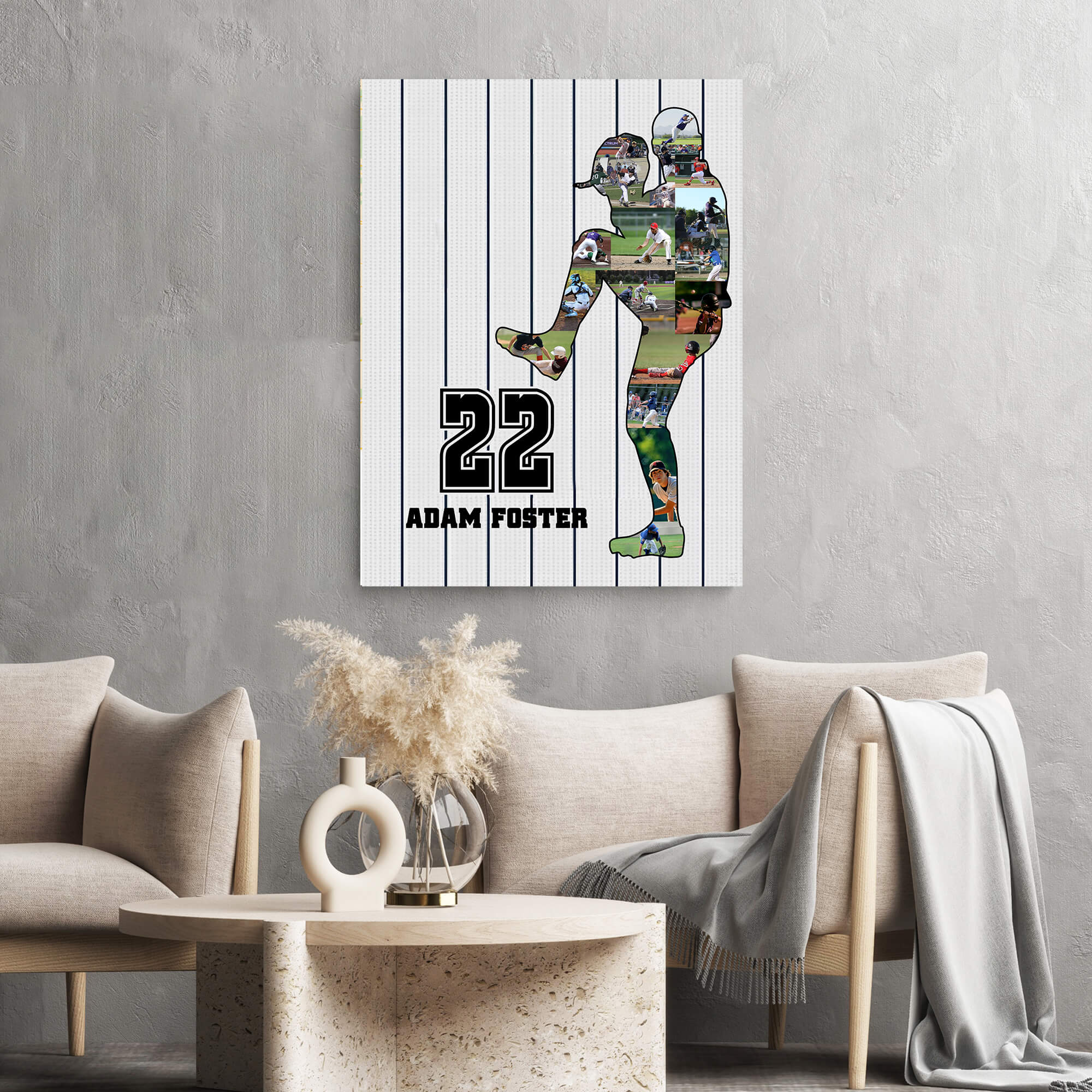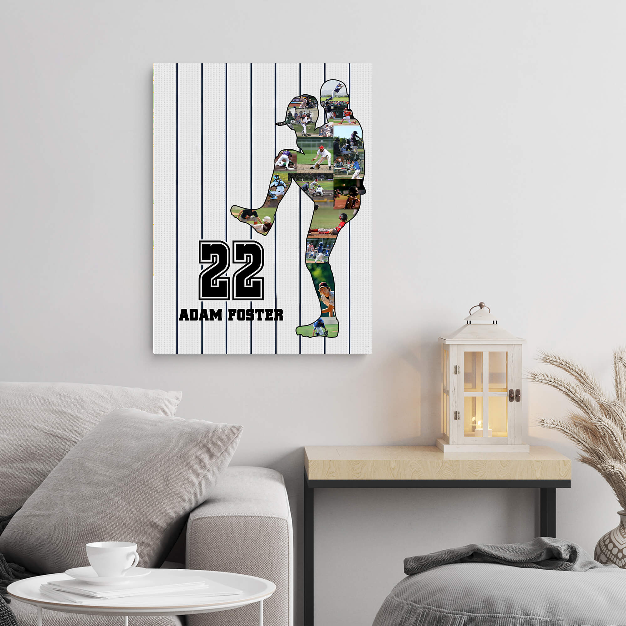 The canvas showcases a meticulously arranged collage of baseball images, skillfully forming the silhouette of a dynamic player mid-pitch. The baseballer’s name and number take center stage, adding a personalized touch to this sporting masterpiece. Against a crisp white background with vertical gray stripes, the canvas exudes the timeless charm of a classic baseball uniform, creating a nostalgic yet contemporary aesthetic.