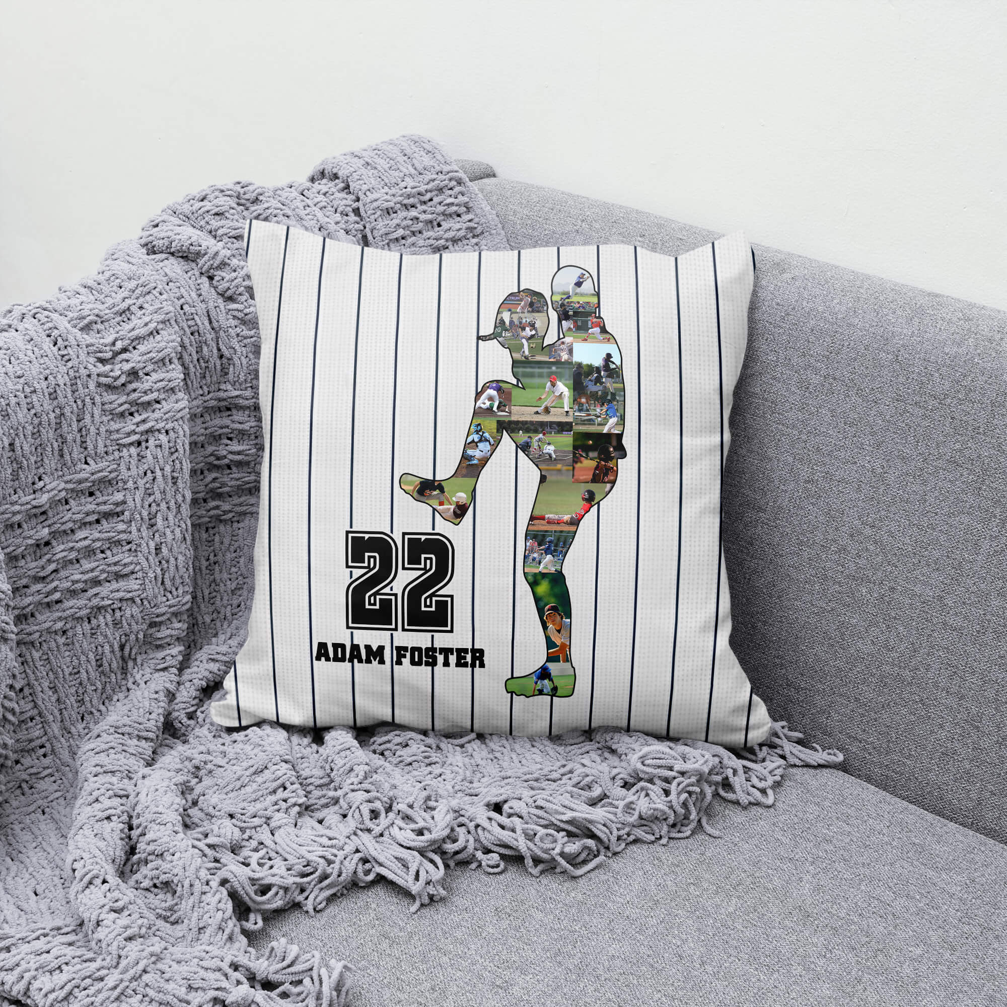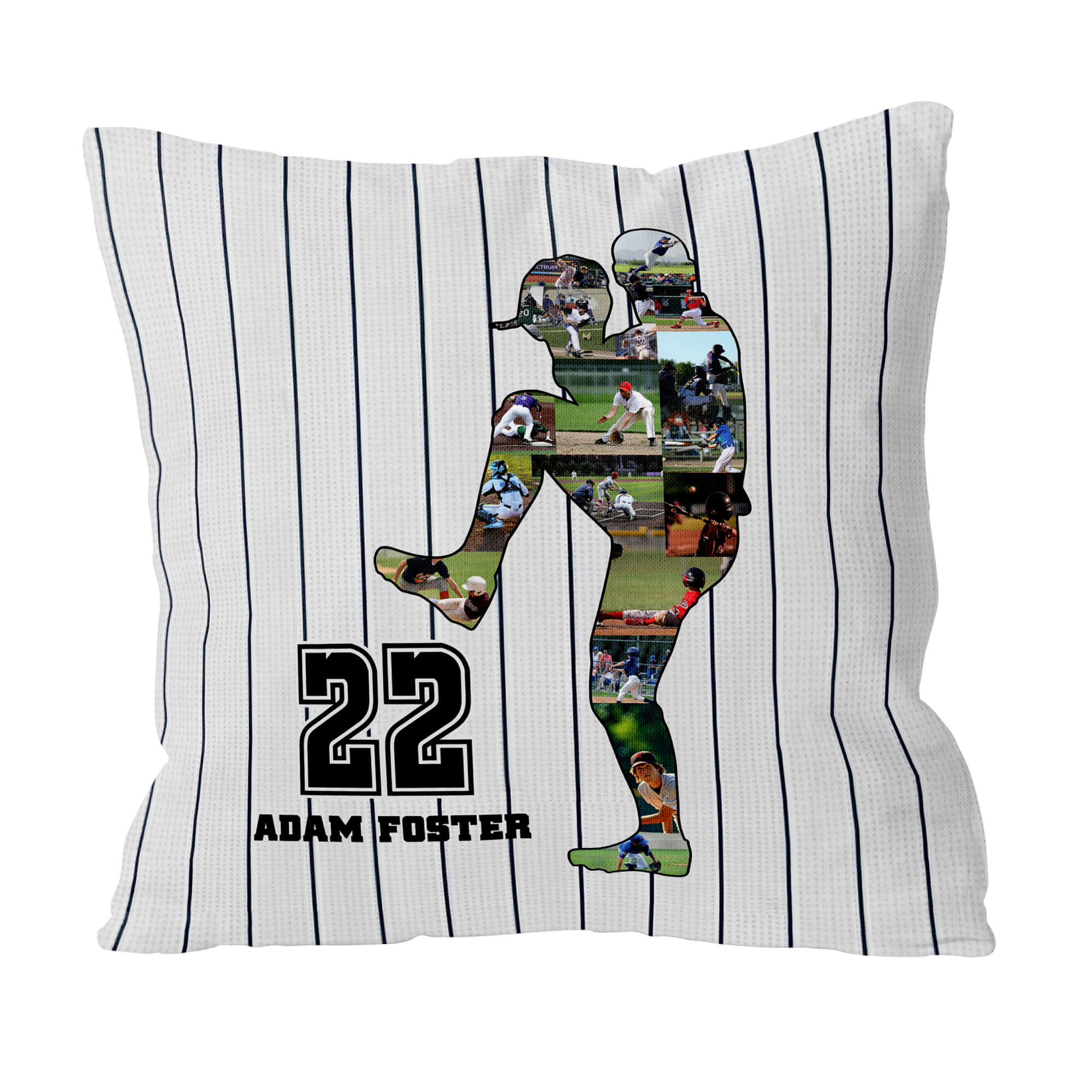 Within the player silhouette, a mosaic of smaller images captures the essence of unforgettable moments from the game, creating a visually striking tribute to the sport. Crafted with a perfect balance of quality and comfort, our custom pillow offers a soft and plush feel at an affordable price, making it an ideal addition to your home or a thoughtful gift for any baseball enthusiast.