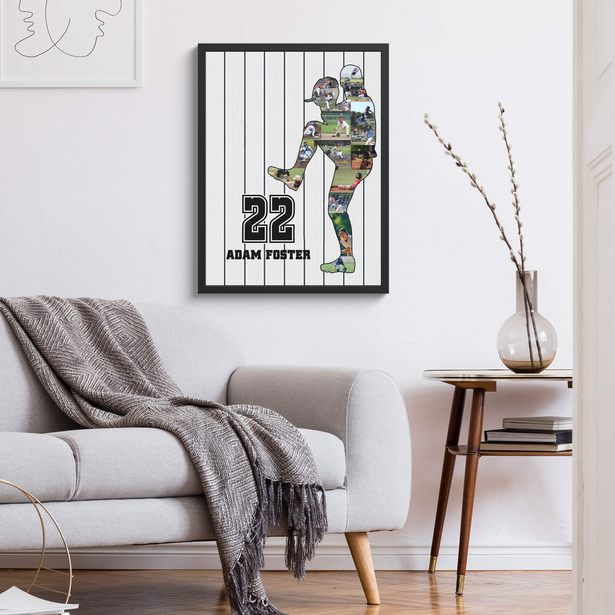 Score a home run in home decor with our Baseball Collage Photo Personalized Framed Print. This striking piece combines the excitement of baseball with a personal touch, featuring a carefully arranged collage of images forming the silhouette of a player mid-pitch. The baseballer’s name and number take center stage against a white background with vertical gray stripes, reminiscent of a classic baseball uniform. Encased in a high-quality frame, this personalized framed print is not just a decoration; it’s a visual celebration of the sport. Crafted with meticulous attention to detail, this framed print seamlessly combines affordability with sophistication, making it the perfect addition to any baseball lover’s space or a thoughtful gift to capture the spirit of the game.