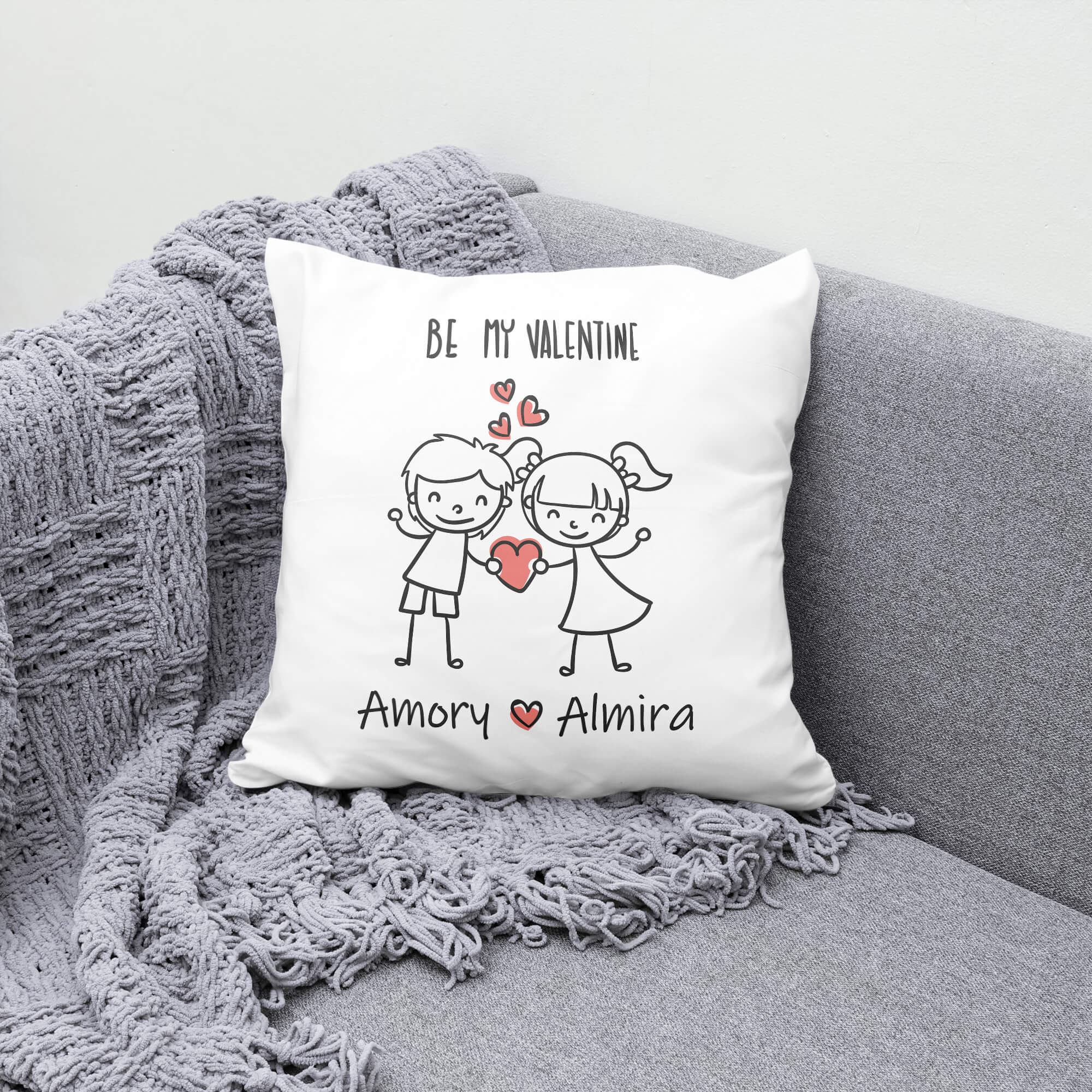 Cuddle up in the warmth of personalized love with the Be Mine Valentine Custom Name Pillow. This cozy accent piece features a charming illustration of two characters holding a heart, surrounded by smaller hearts—a minimalist design that exudes affection. The prominent “BE MY VALENTINE” invites romance, and the customizability allows you to replace the sample names with your own, creating a truly unique pillow. Whether placed on your sofa or bed, this custom pillow becomes a daily reminder of your special bond. Express your love uniquely and stylishly with this Be Mine Valentine Custom Name Pillow.