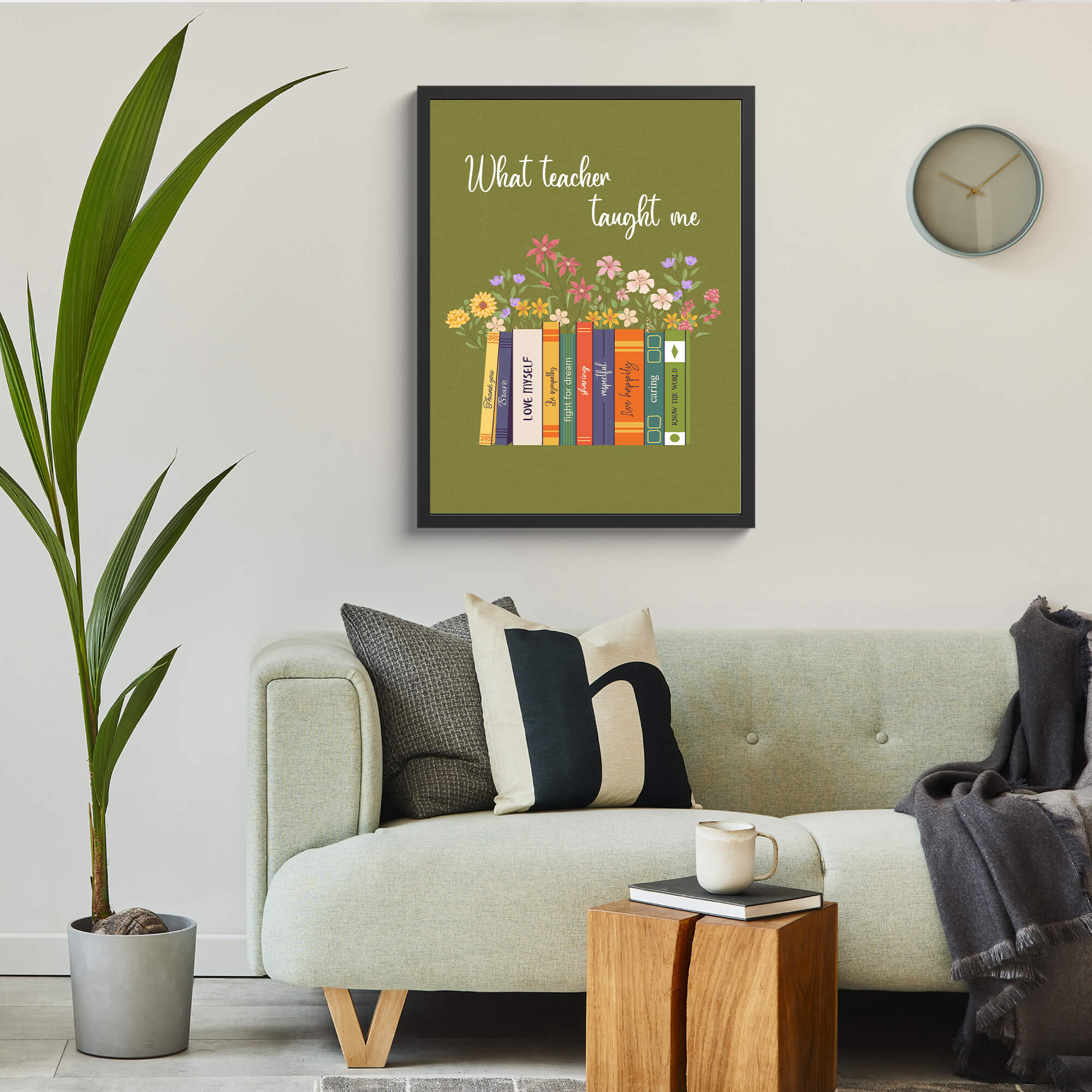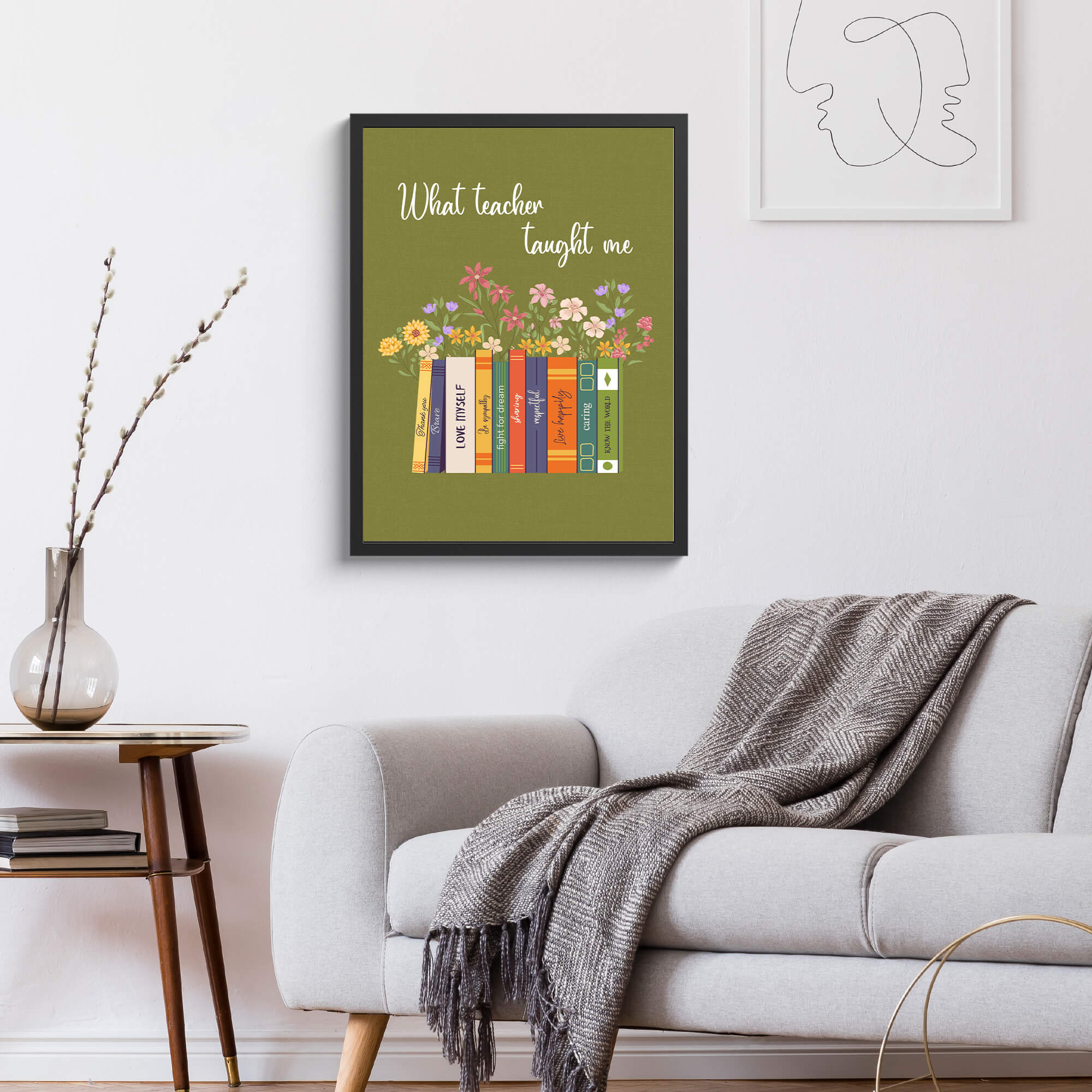 Celebrate the dedication and impact of teachers with our Bookshelf Custom Framed Print, a heartfelt gift that honors their invaluable role in shaping young minds. This meticulously crafted framed print features a serene green background adorned with an elegant white cursive script at the top, reading: “What teachers taught me.” Below, an illustration of a bookshelf takes center stage, filled with colorful books inscribed with uplifting words and phrases. Each book spine can be customized to reflect the knowledge or virtues your beloved teacher imparted to you. The arrangement of books creates a sense of order and purpose, symbolizing the valuable lessons teachers provide throughout a student’s journey. Adorned with vibrant illustrations of flowers above the bookshelf, this framed print adds a touch of natural beauty to any space. It’s a timeless keepsake that serves as a constant reminder of the teacher’s dedication and the transformative power of education.📚