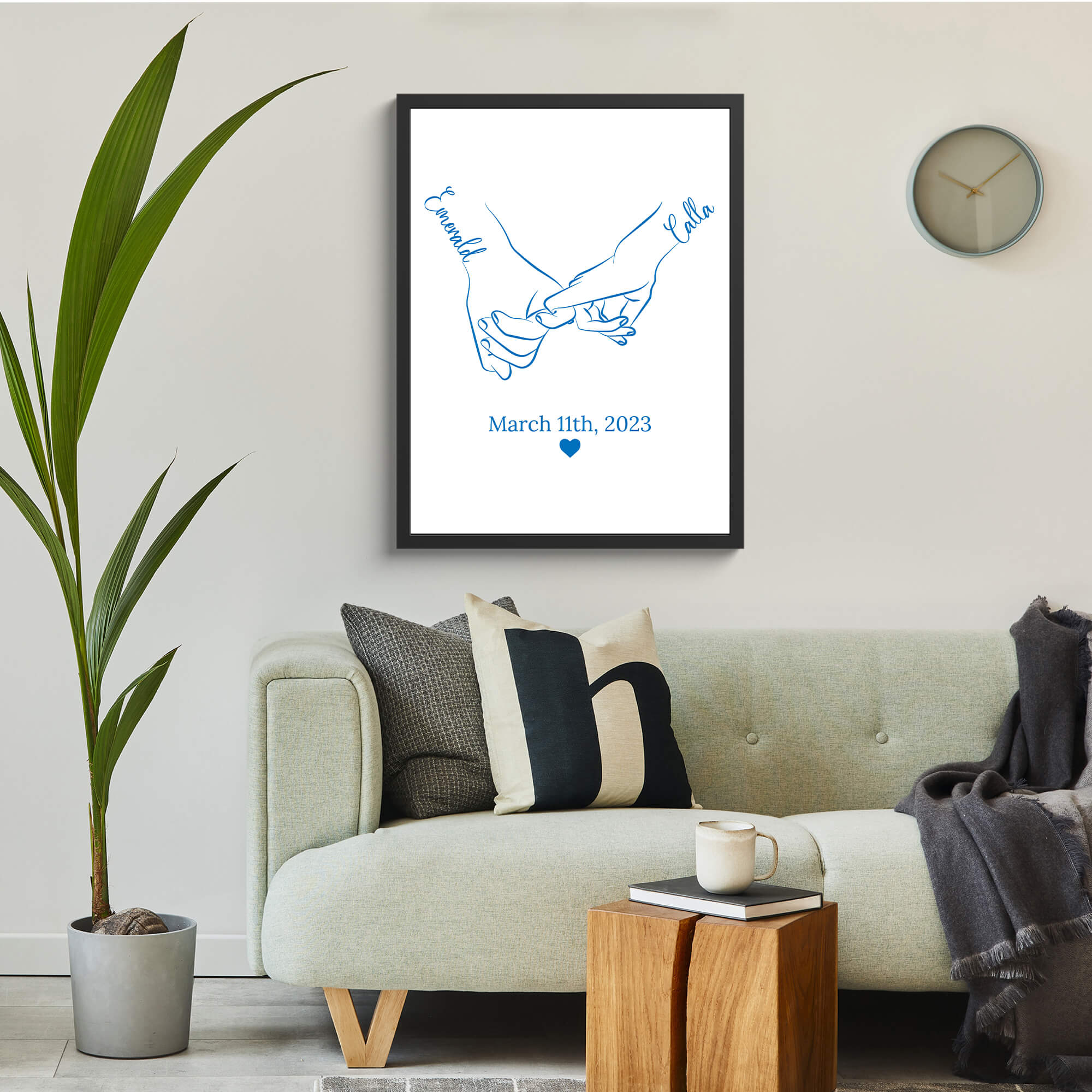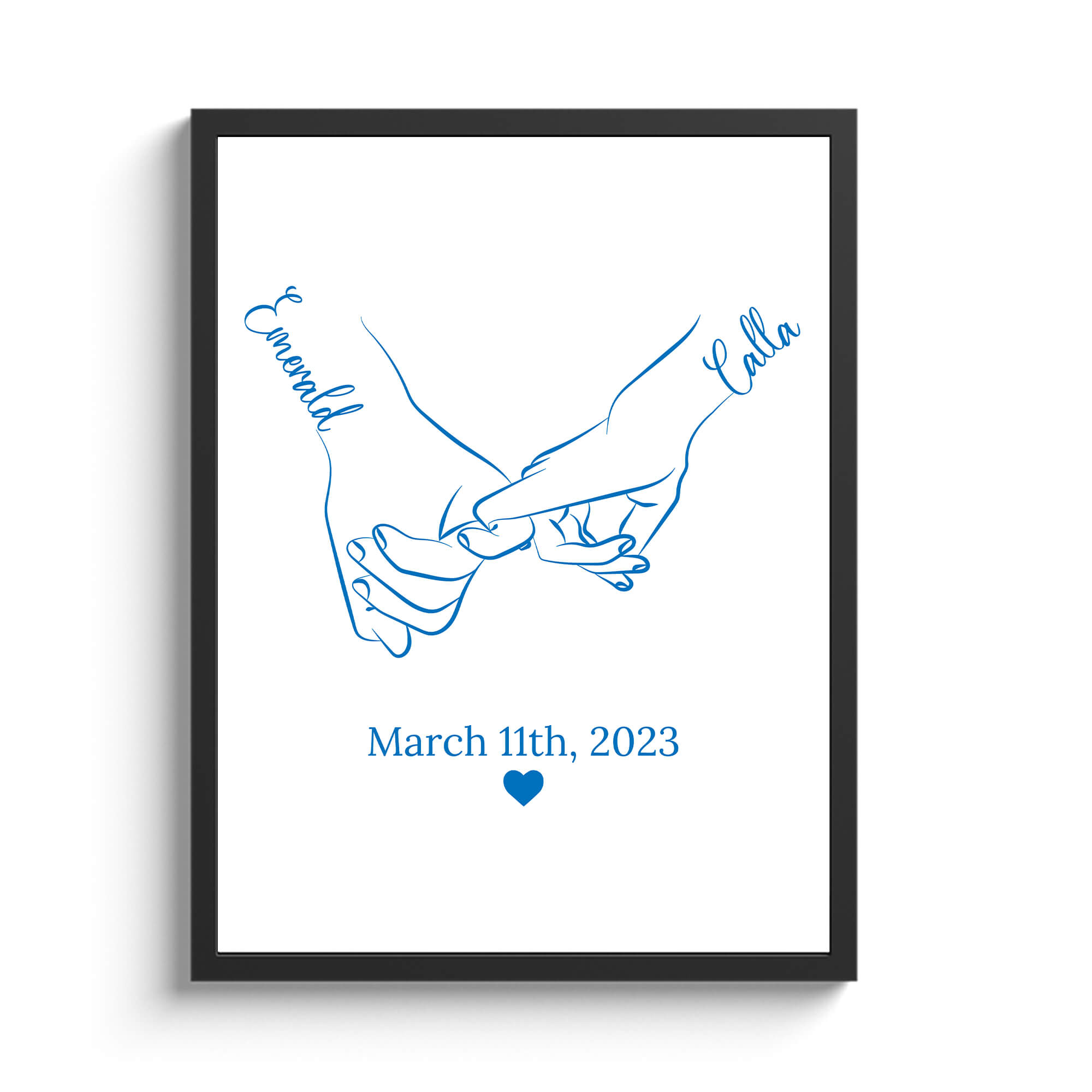 Transform your space into a gallery of love with the Custom Holding Hands Framed Print. This exquisite masterpiece captures the essence of a special connection through an elegant line drawing in a serene shade of blue. The two hands, gracefully intertwined, symbolize unity and love. The names of the couple, delicately scripted beside each hand, add a personalized touch, creating a unique and meaningful piece of art. Below the drawing, a significant date accompanied by a small heart symbol commemorates a momentous day. Encased in a stylish frame, this custom framed print becomes a timeless and elegant addition to your home, offering a daily reminder of the beauty and warmth of your special bond.