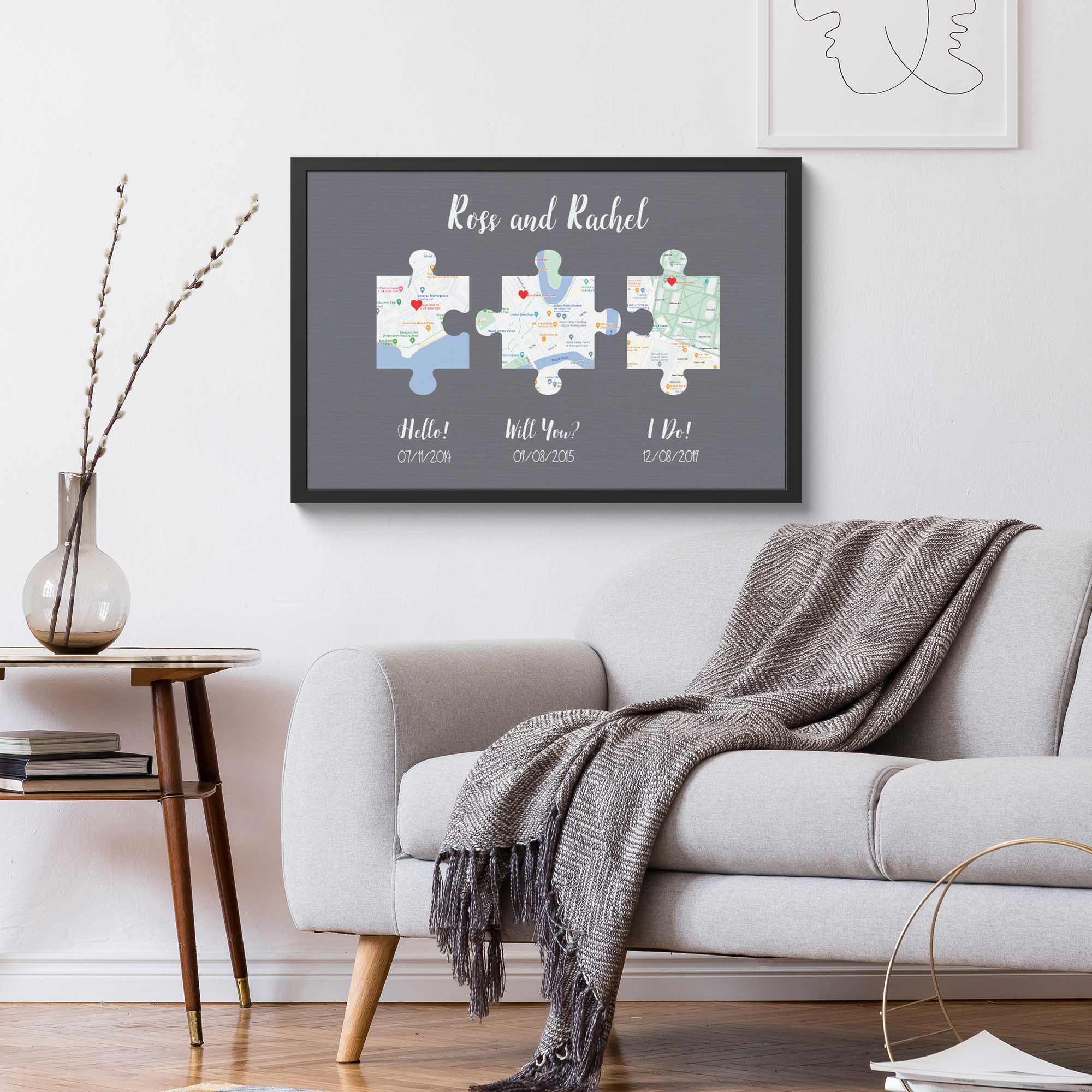 Commemorate your love story with the Customized Framed Print Hello! Will You? I Do! This elegant framed print features three puzzle pieces capturing the essence of your journey. The first piece marks the place and date of your first meeting, the second embodies the promise to spend a lifetime together, and the third showcases the beautiful day you exchanged vows. Perfect for weddings or anniversaries, this framed print is not just a decoration but a timeless representation of your eternal love.