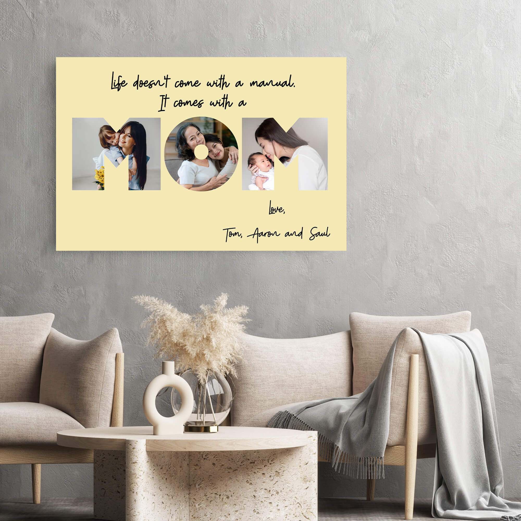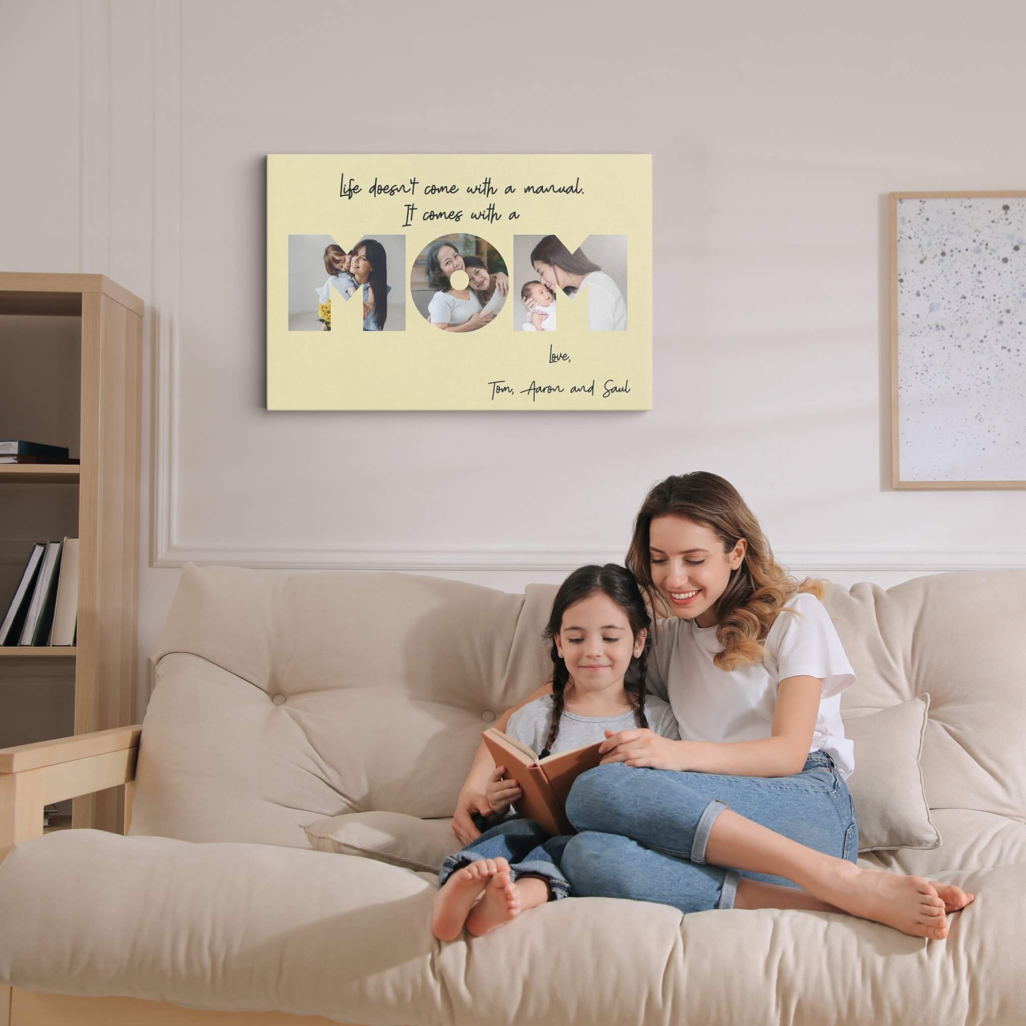 This mom canvas print allows you to create a personalized canvas print with your photos and messages for your mom. We seamlessly integrate images capturing the joyous moments between a mother and her children into the very essence of the words “Mom” or “Mother” or even your mother’s name, creating a stunning canvas painting that tells the unique story of your family.