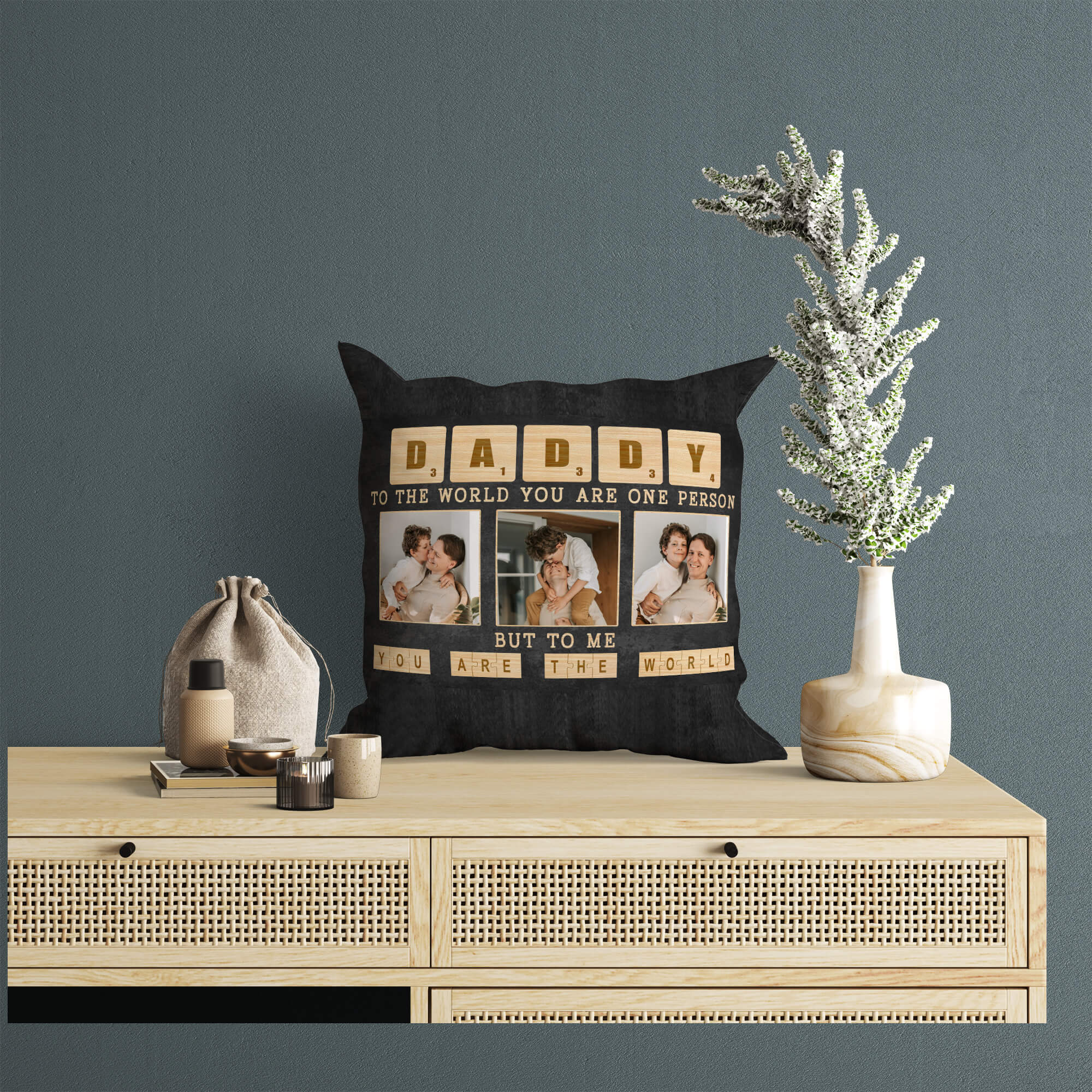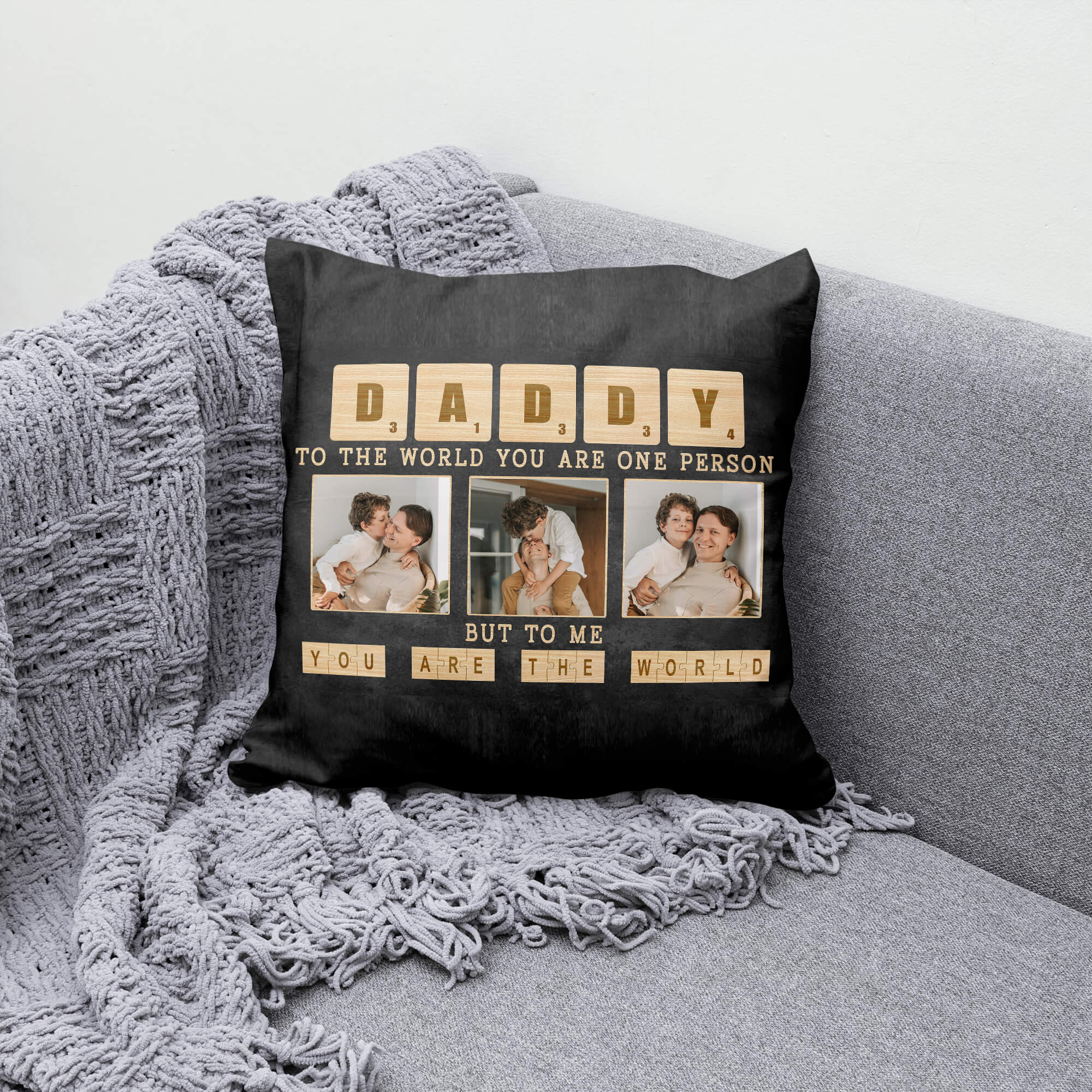Wrap your dad in the warmth of love with our Daddy To The World You Are One Person Custom Pillow. This personalized accent piece not only adds a touch of comfort to any space but also serves as a daily reminder of the cherished moments and love that define your family.