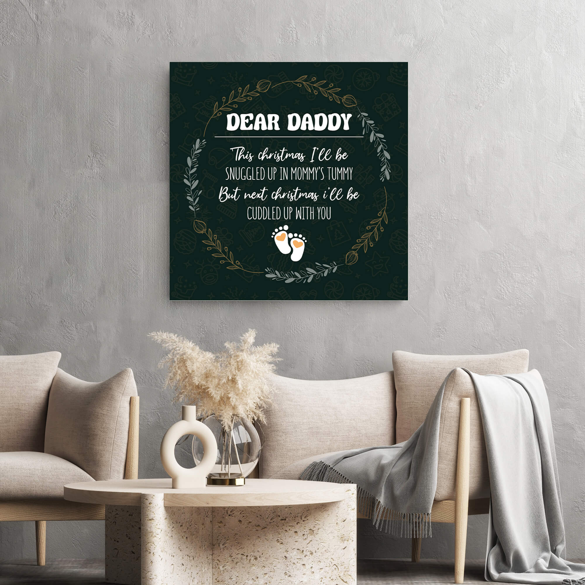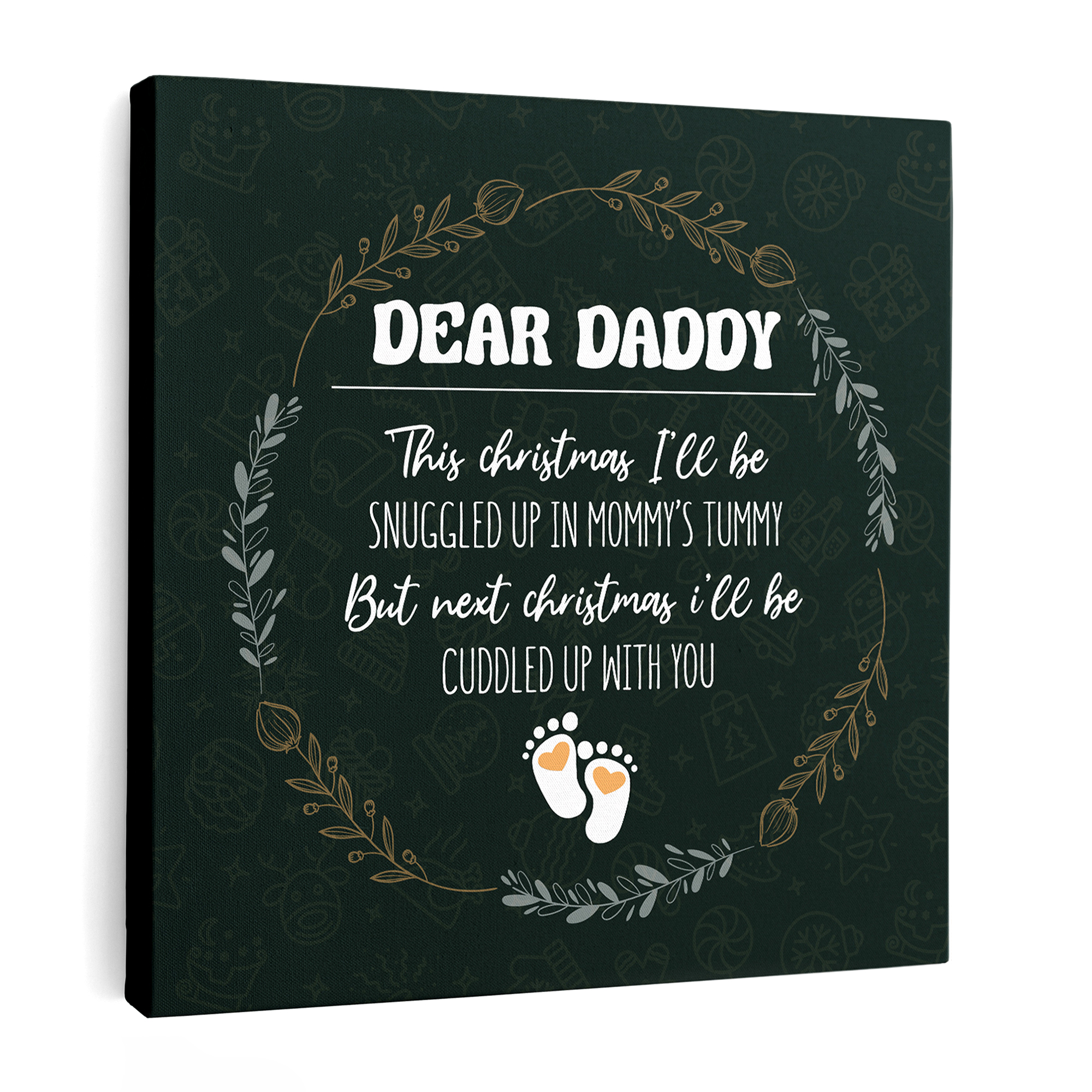 Embrace the joy of impending fatherhood with our Dear Daddy This Christmas I’ll Be Snuggled Canvas Print. This heartwarming and adorable circular canvas print features a dark green background adorned with white text. The sentiment is surrounded by a golden wreath, and two small baby feet grace the bottom, creating a visually striking and touching design.