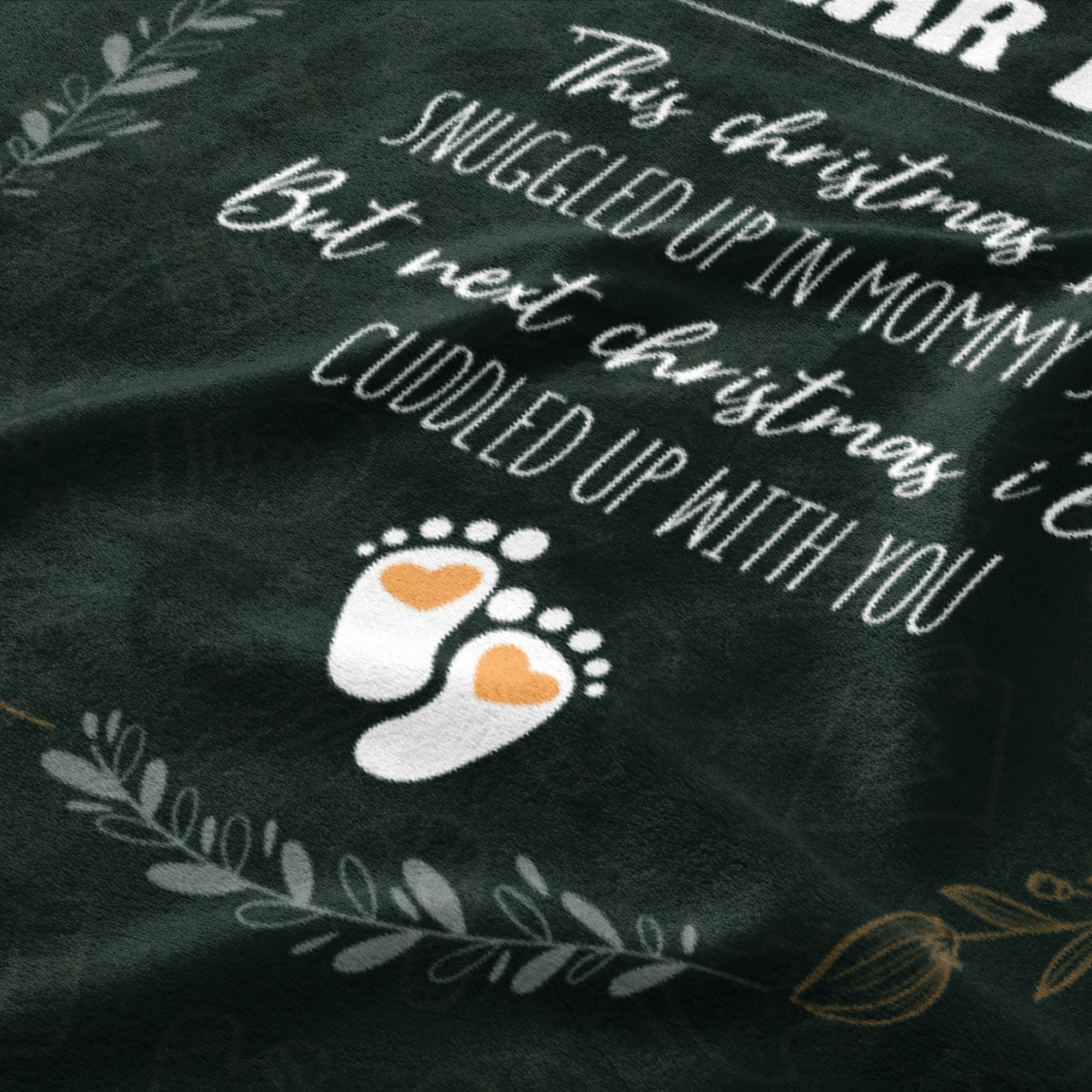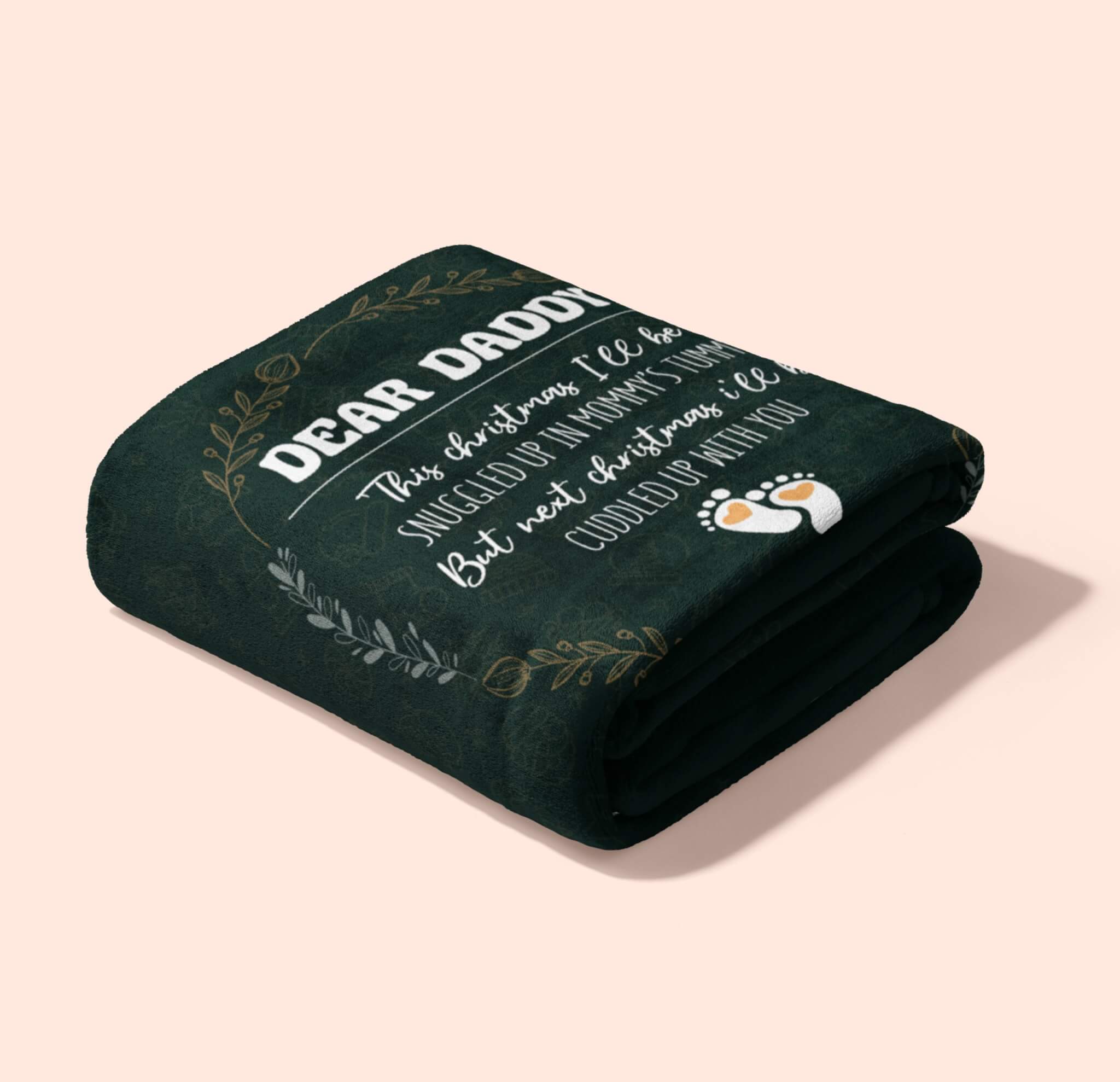 Wrap yourself in the warmth of impending fatherhood with our “Dear Daddy This Christmas I’ll Be Snuggled” Custom Blanket. This customizable and sentimental blanket features a heartwarming message in white against a dark green, is surrounded by a golden wreath, and is adorned with two small baby feet.