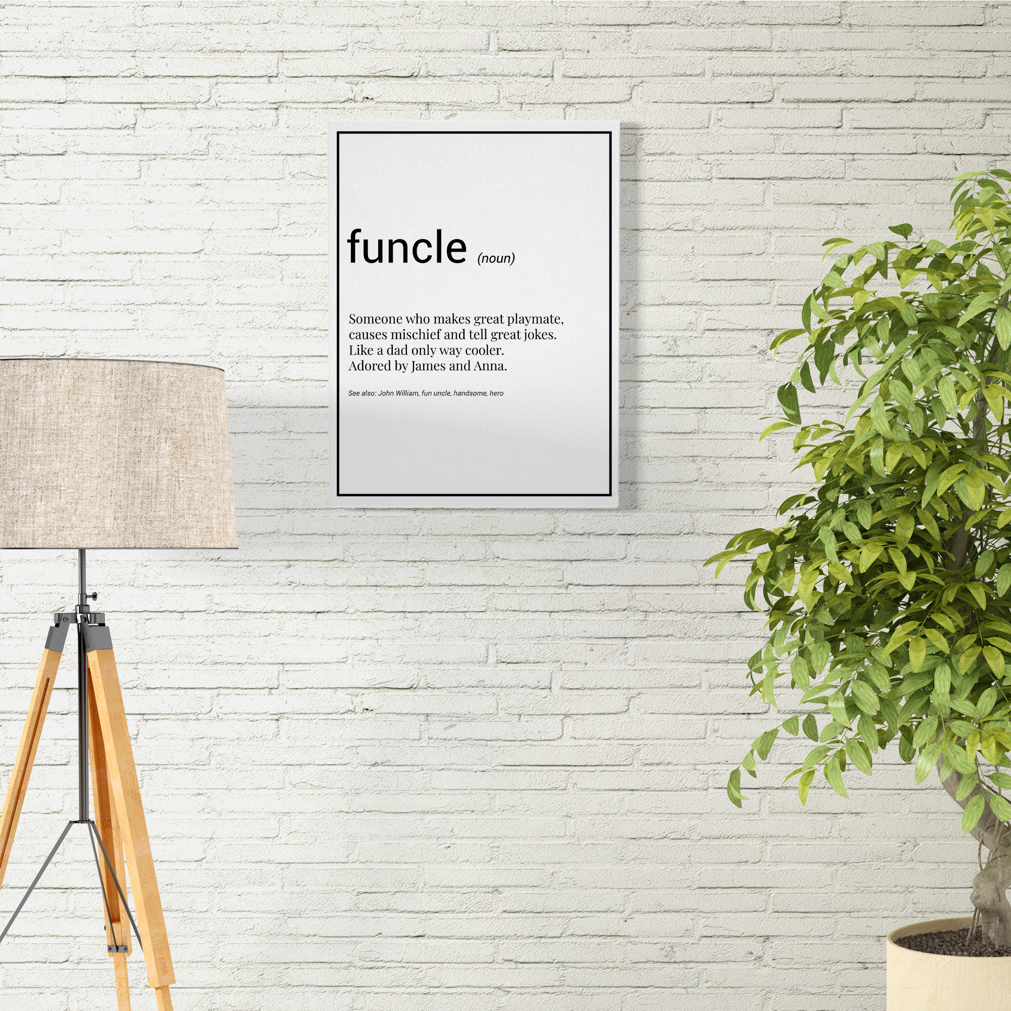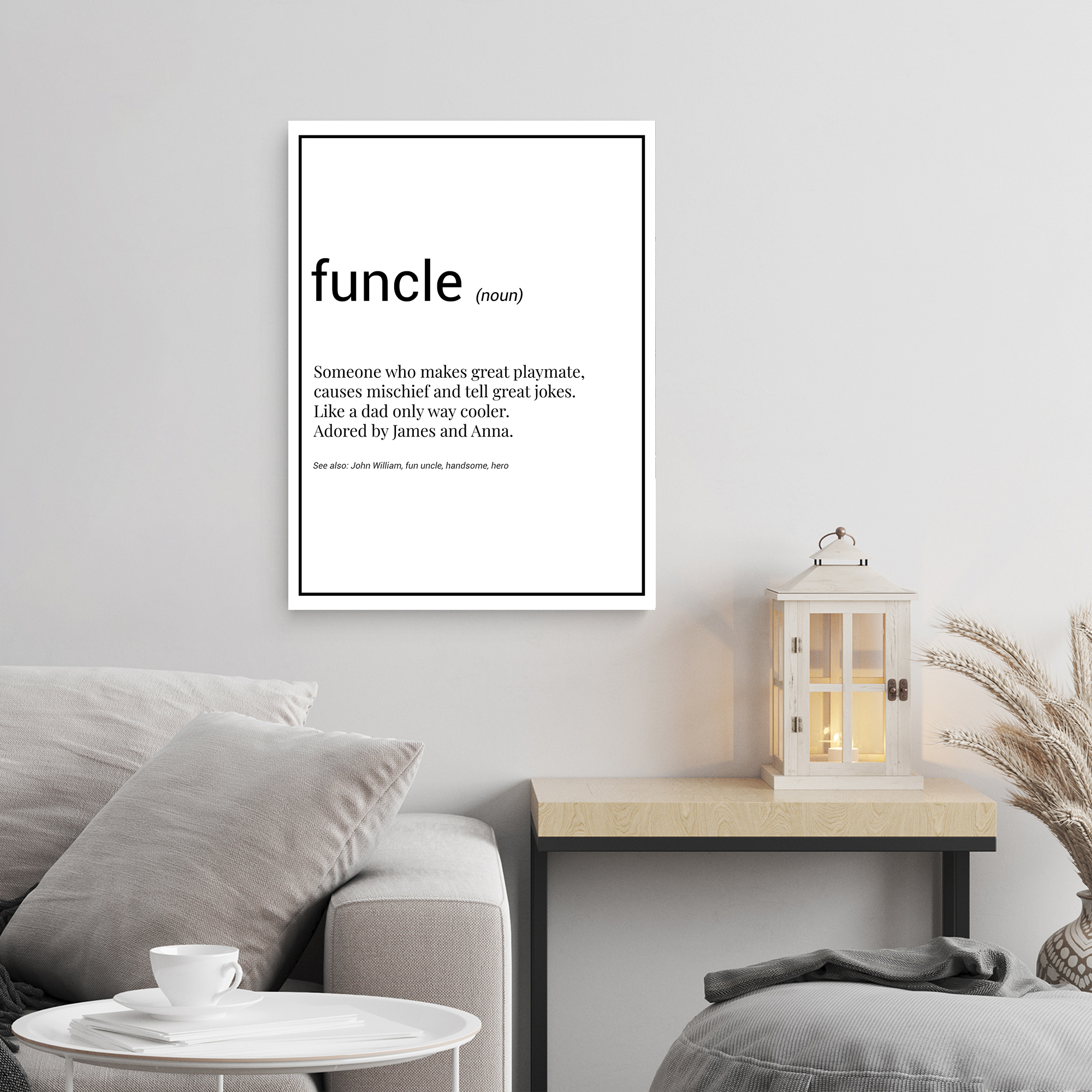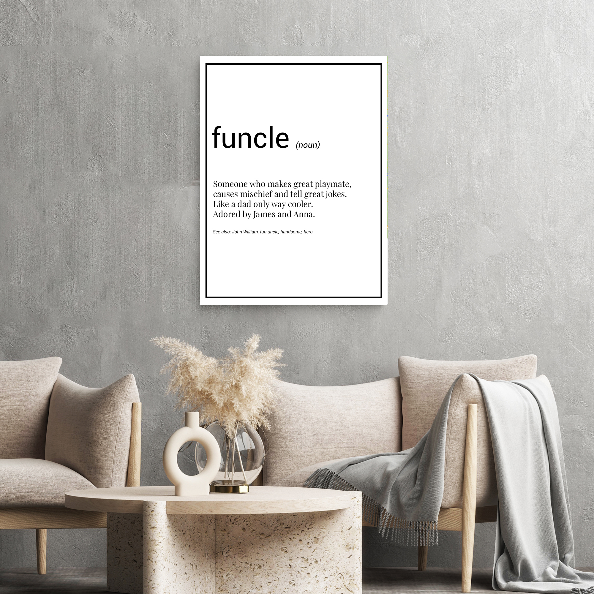 Crafted with precision, this custom canvas print boasts a high-quality print, combining simplicity with elegance. The clean design and well-defined text make it a versatile addition to any room, offering a timeless tribute to the fun-loving uncle in your life. Whether as a thoughtful gift for a special occasion or simply to express appreciation, this custom canvas print is a meaningful way to celebrate the unique role of a funcle—a cherished figure who brings joy and laughter to the family dynamic.