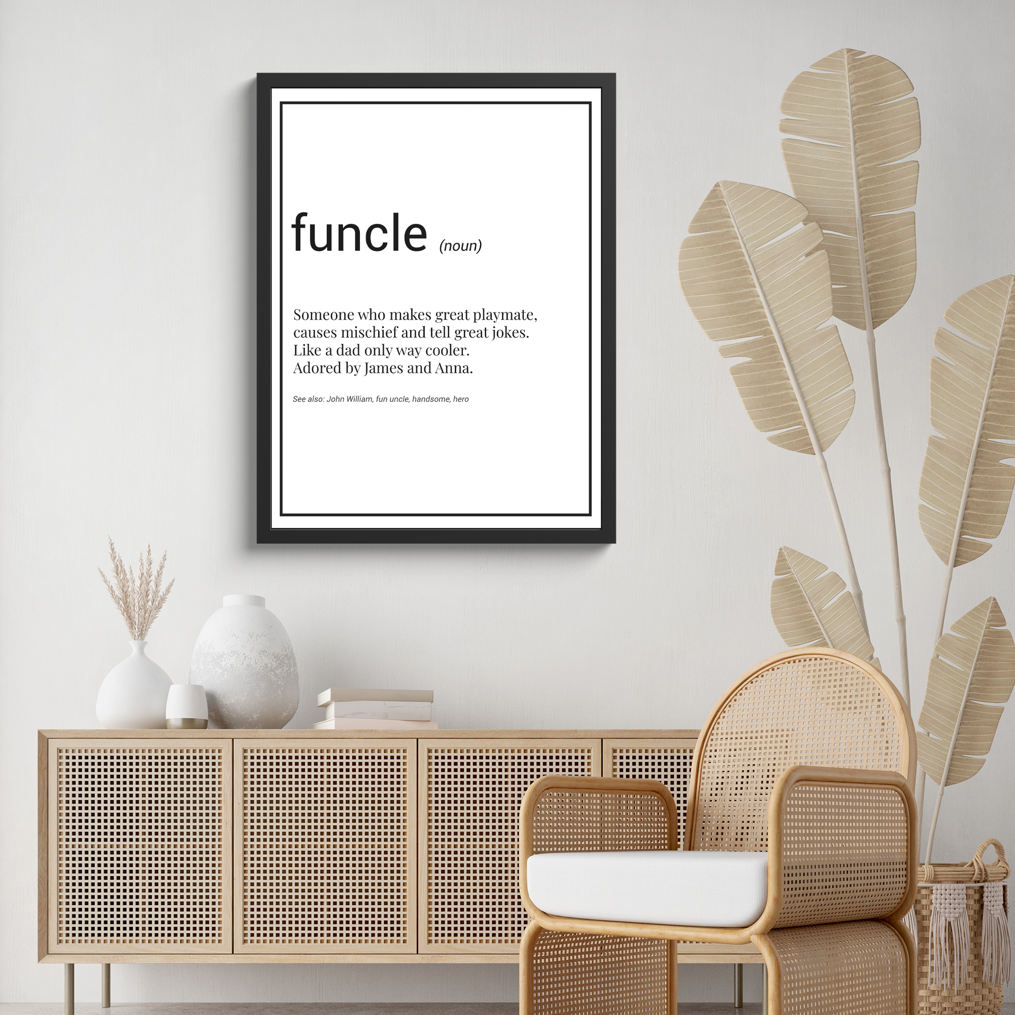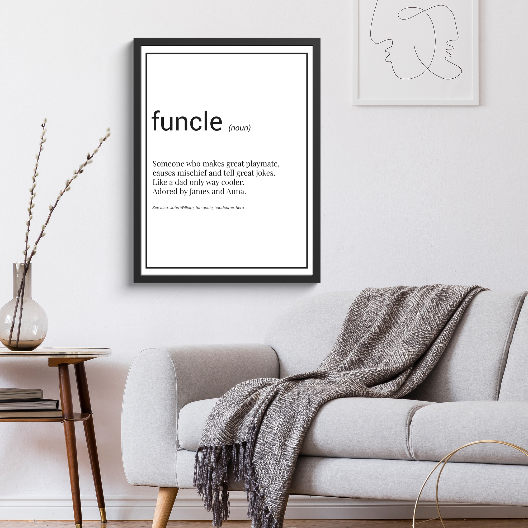 Add a touch of humor and heart to your home decor with our “Funcle” Meaning Custom Wall Framed Print. Against a clean white background, the black text defines “Funcle” as the cool uncle who’s a great playmate, mischief-maker, and jokester. This framed print is a thoughtful and stylish way to celebrate the unique role of your fun-loving uncle. Crafted with precision, it combines simplicity with elegance, making it a timeless and meaningful addition to any room.