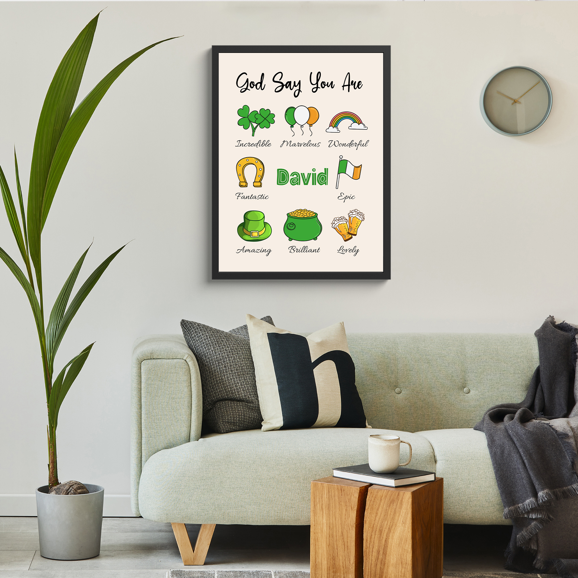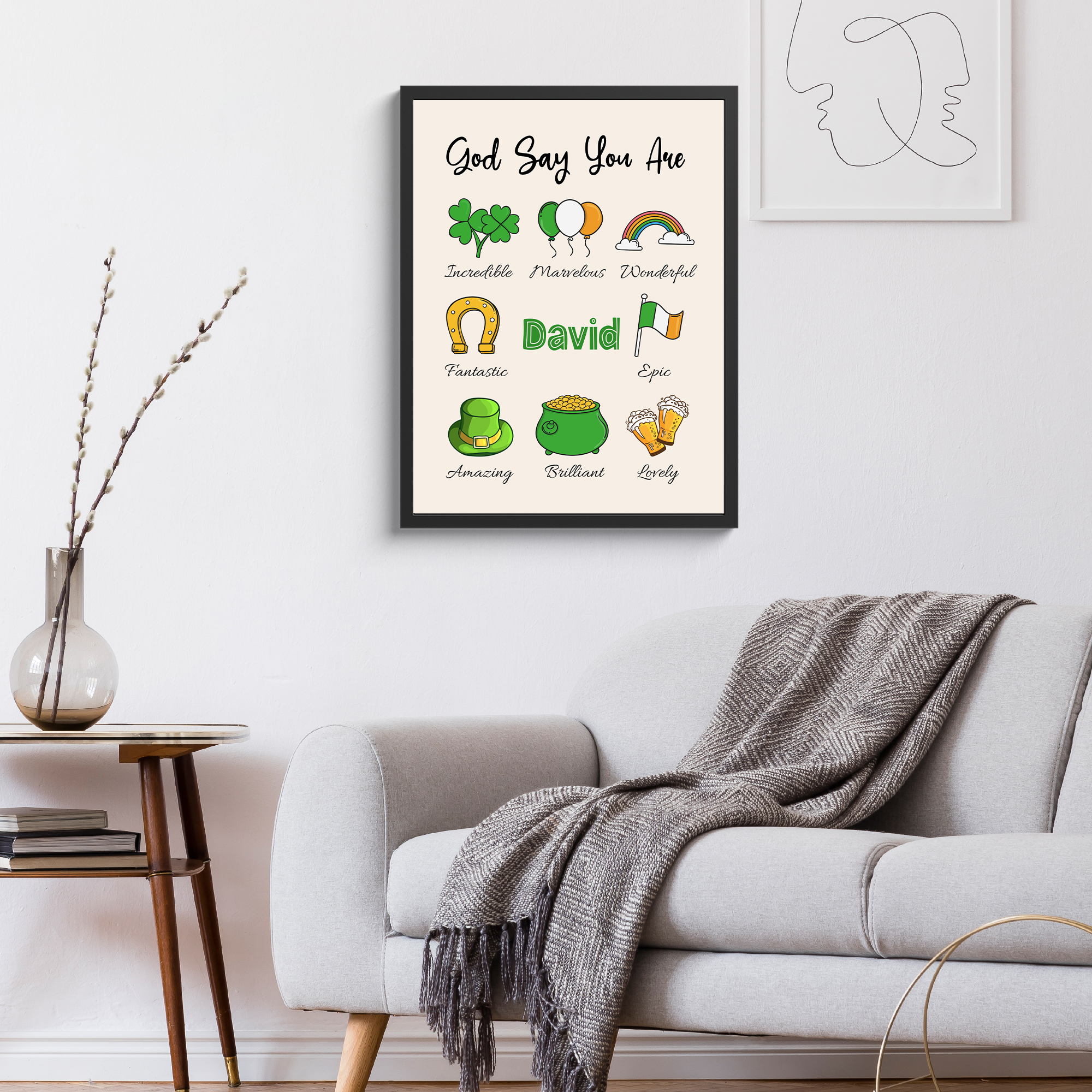 Elevate your St. Patrick’s Day celebrations with our “God Says You Are” Custom Framed Print, a personalized tribute to spread positivity and joy. This charming framed print features a delightful array of St. Patrick’s Day-themed illustrations, including clovers, balloons, rainbows, horseshoes, pots of gold, and beer mugs. At the top, in bold letters, it reads “God Says You Are,” reminding the recipient of their inherent worth and value. Below, each illustration is accompanied by a personalized adjective chosen to describe or compliment your friend or loved one, and his or her name is illustrated in the center. Encased in a sleek frame, this custom framed print becomes a cherished keepsake that adds a touch of Irish cheer to any home decor.🍀