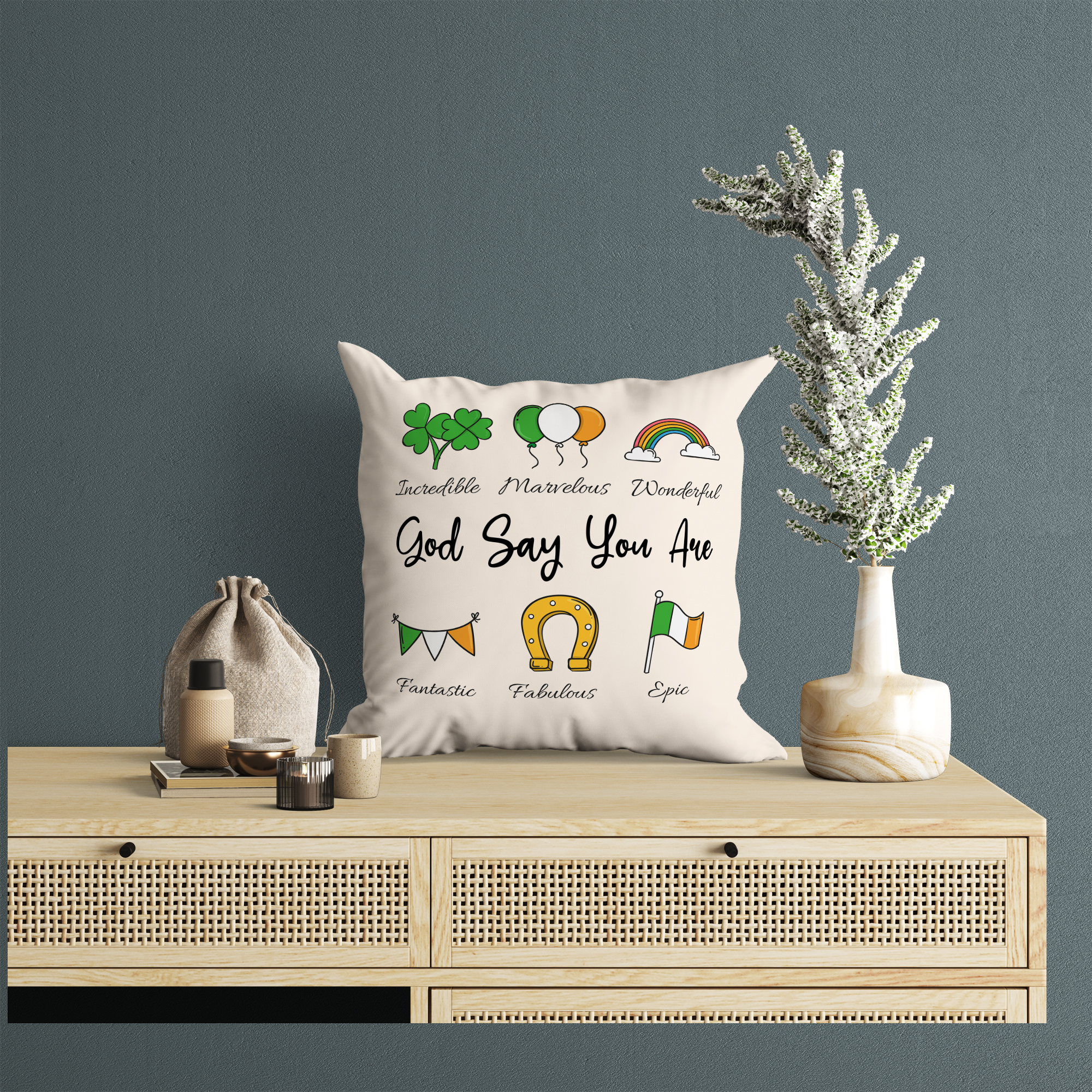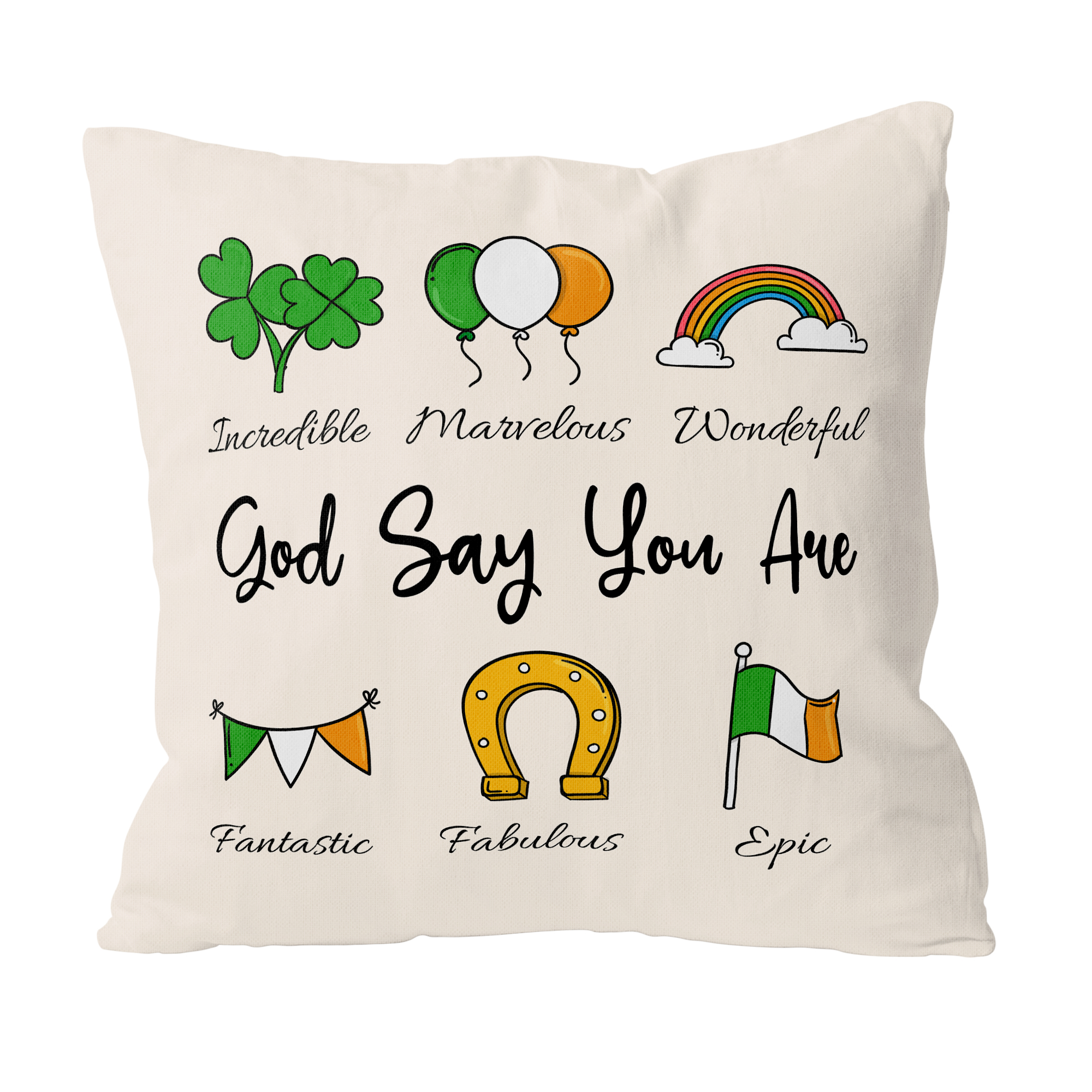 Wrap your loved ones in Irish cheer and positivity with our “God Says You Are” Custom Pillow, the perfect addition to your St. Patrick’s Day celebrations. Crafted from soft and luxurious fabric, this pillow features a whimsical array of St. Patrick’s Day-themed illustrations, including clovers, balloons, rainbows, horseshoes, pots of gold, and beer mugs. At the center, in bold letters, it reads “God Says You Are,” reminding the recipient of their inherent worth and value. Around, each illustration is accompanied by a personalized adjective chosen to describe or compliment your friend or loved one. Whether used for snuggling up on the couch or as a decorative accent in the bedroom, this custom pillow spreads positivity and joy wherever it goes.🍀