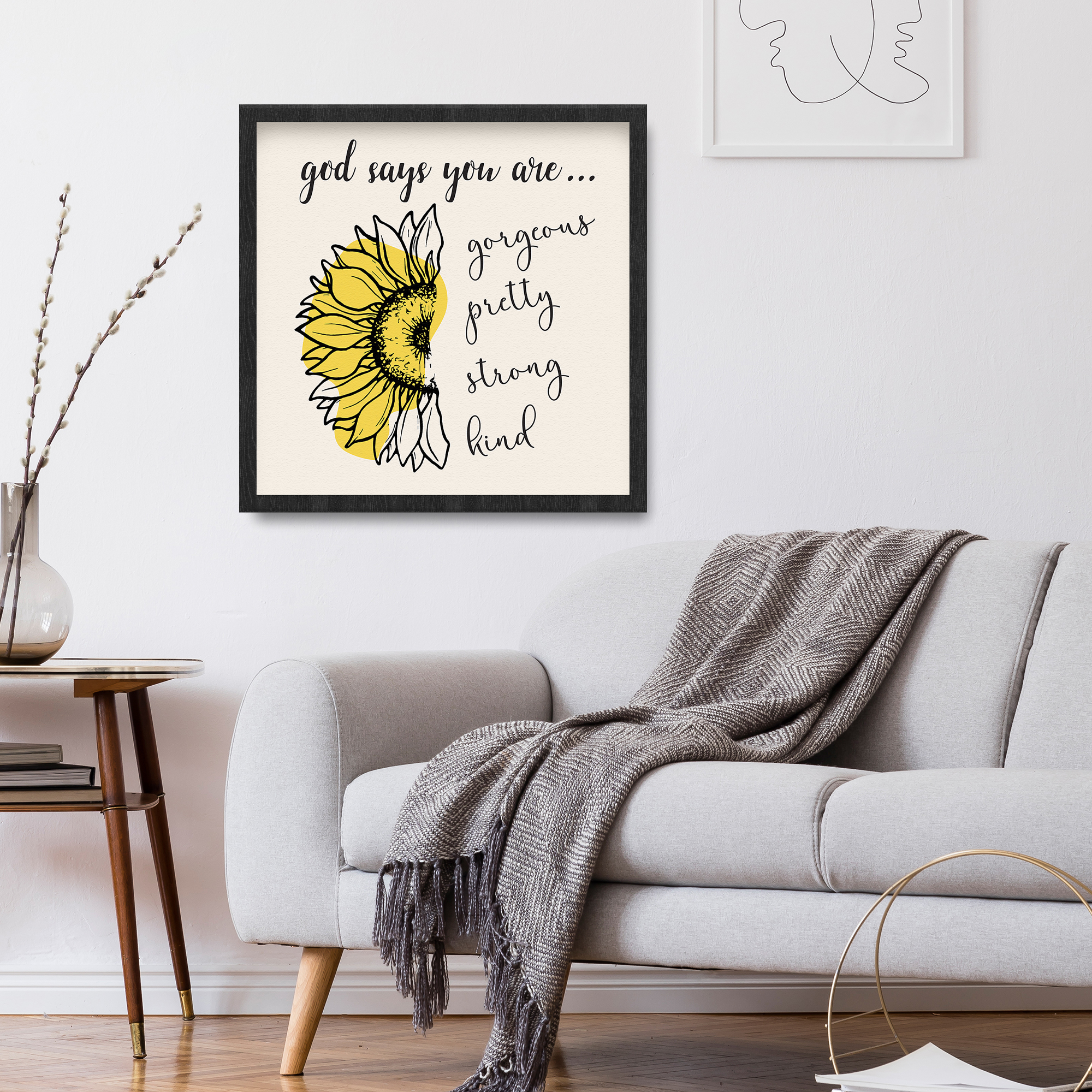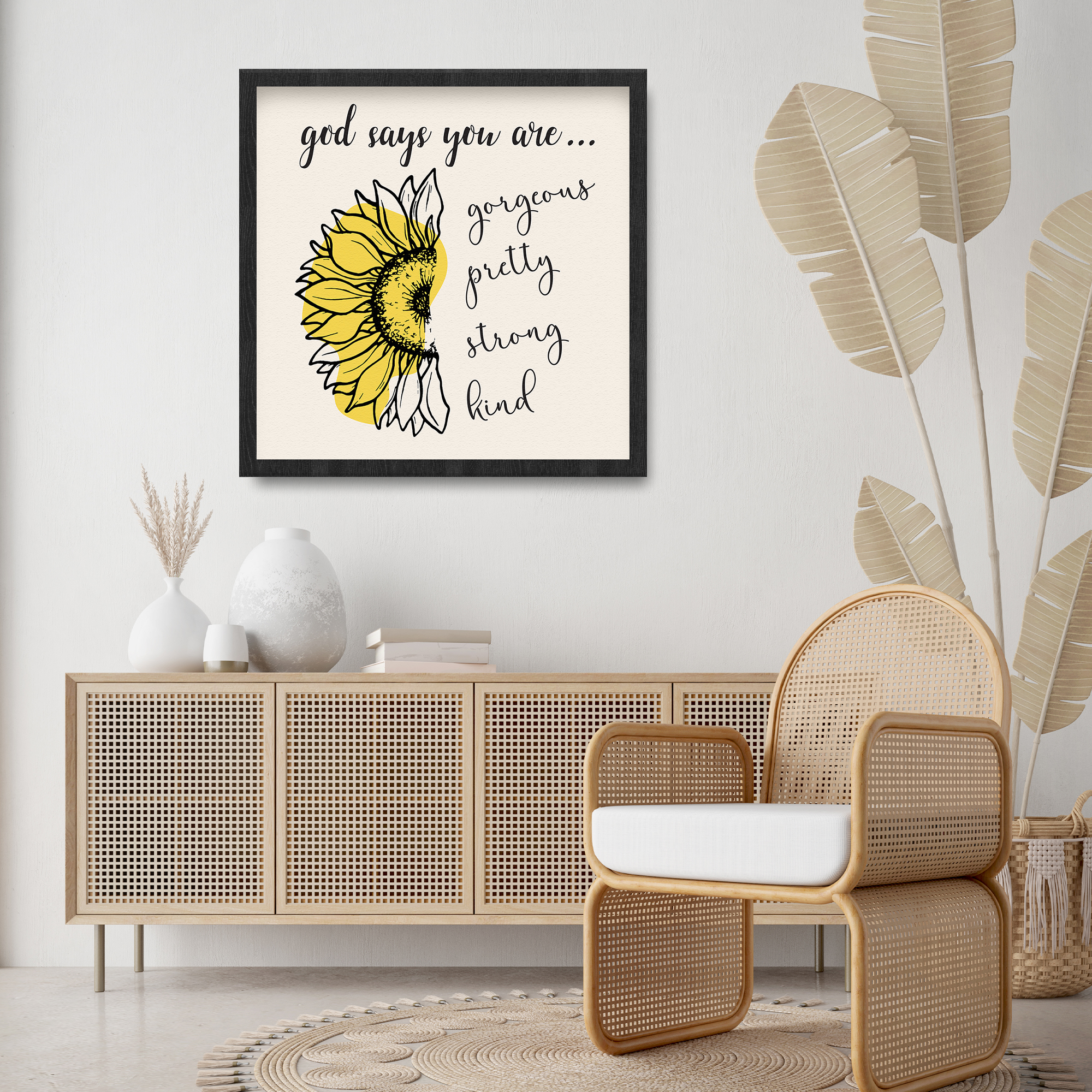 Transform your living space into a sanctuary of positivity and inspiration with our God Says You Are Wall Art Sunflower Framed Print. This elegant piece combines the timeless beauty of a sunflower with a divine message, creating a daily reminder of the inherent qualities that make you unique. The detailed sunflower, with its vibrant yellow petals, takes center stage, radiating positivity and strength. Above, delicate lowercase cursive writing whispers the empowering message, “god says you are…,” setting the stage for a list of qualities that define your character. Encased in a high-quality frame, this print seamlessly blends affordability with sophistication, making it the perfect addition to your home or a thoughtful gift for a friend. Celebrate the beauty of self-affirmation with this framed print that blooms with positivity.