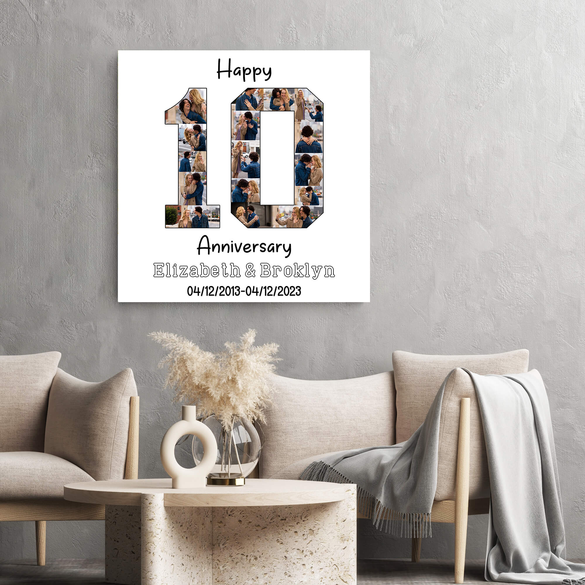 Celebrate a decade of love with our Happy 10th Anniversary Photo Collage Canvas Print—an ideal, customizable gift for couples. This thoughtful keepsake, reasonably priced without compromising quality, features a collage of the couple’s special moments over the years. Their names and anniversary dates elegantly printed below personalize the piece, making it a cherished reminder of their journey together. Vibrant colors and sharp details on high-quality canvas ensure a lasting, visually striking representation of their love story. Whether displayed proudly in the living room or taking center stage in a dedicated space for cherished mementos, the Happy 10th Anniversary Photo Collage Canvas Print is sure to be a cherished focal point in the couple’s home. the custom canvas print not only celebrates a decade of love but also anticipates many more years of happiness yet to come.