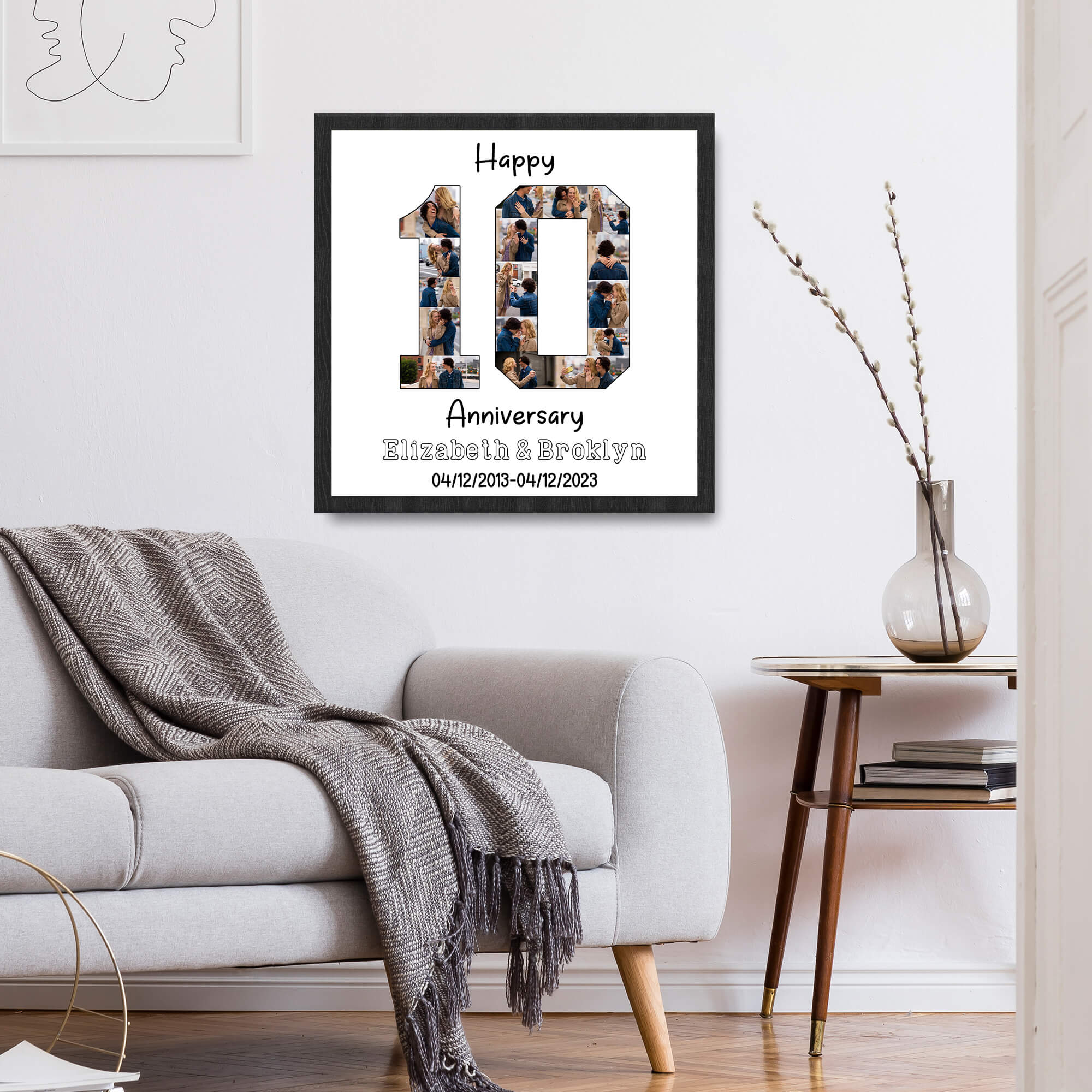 Celebrate a decade of love with our Happy 10th Anniversary Photo Collage Framed Print—a personalized and reasonably priced tribute for couples. This thoughtful keepsake features a captivating collage of cherished moments, elegantly framed to showcase their unique journey. With names and anniversary date below, this framed print is a visually appealing and enduring representation of their love story. Whether displayed in the living room or a dedicated space for memories, this framed print is a cherished focal point that beautifully encapsulates the past decade and anticipates the many more years of happiness to come.