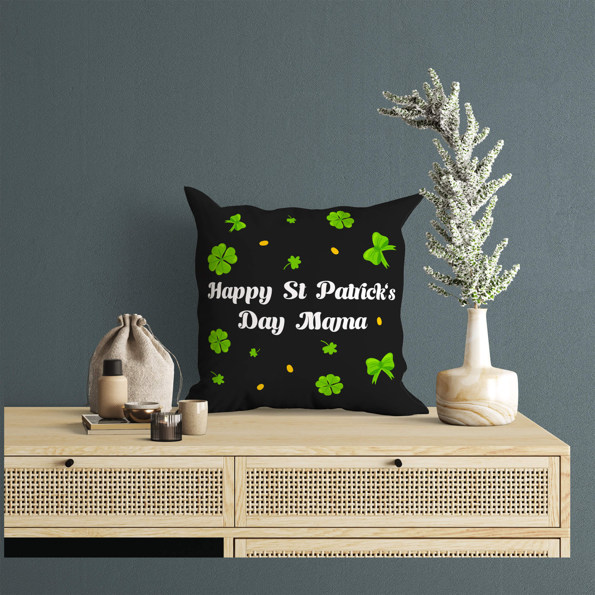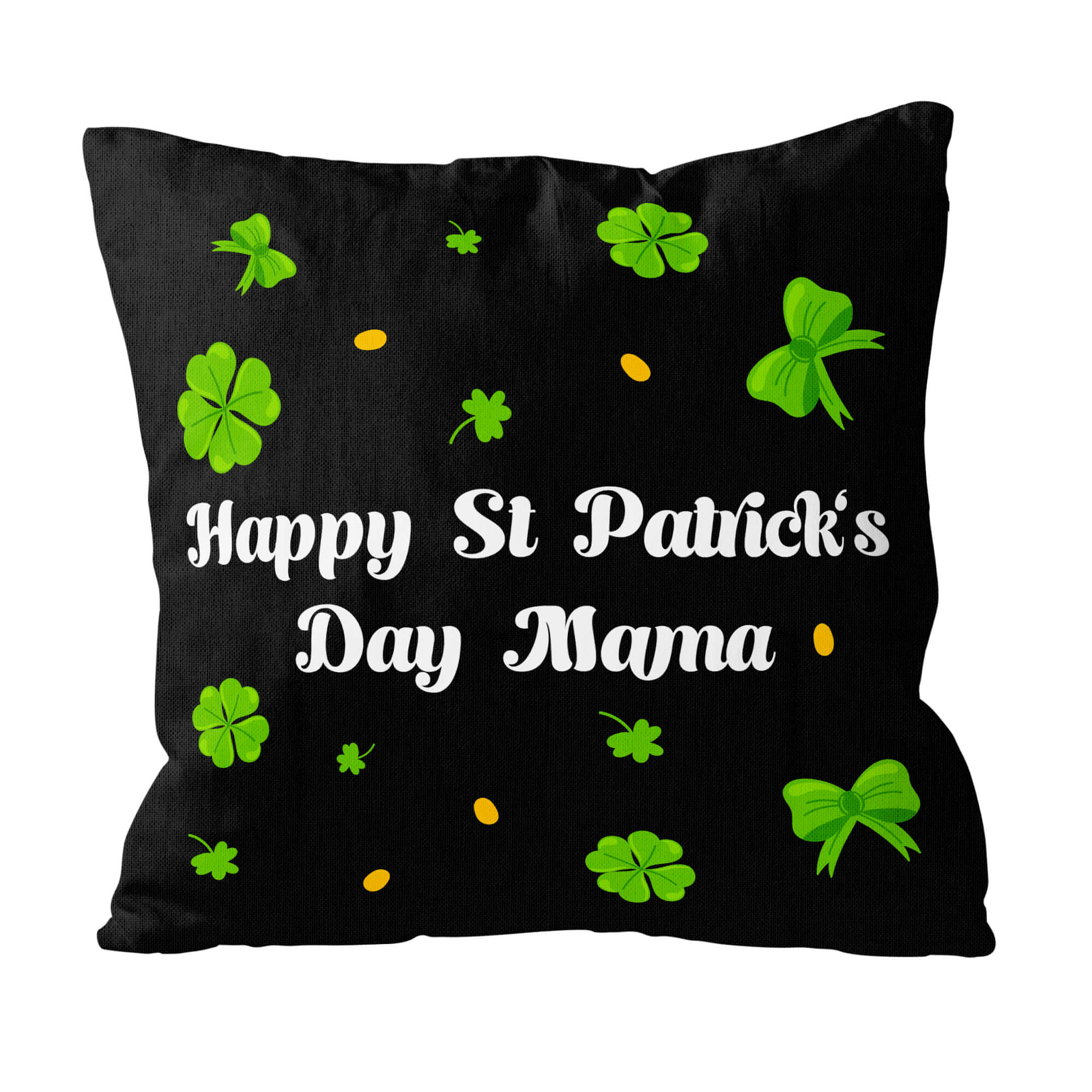 Celebrate St. Patrick’s Day in style with our Happy St. Patrick’s Day Custom Pillow – a lovely gift that will warm the hearts of your loved ones. This delightful pillow features a black velveteen fabric adorned with vibrant green clovers and bows, sprinkled with small yellow dots, evoking the spirit of the Irish holiday. In the center, elegant white cursive lettering reads “Happy St. Patrick’s Day Mama,” adding a personal touch to this festive gift. What makes this custom pillow truly special is its customizable feature, allowing you to send any message to the recipient, making it the perfect way to express your love and appreciation on this special occasion. Whether adorning a sofa, bed, or favorite chair, our Happy St. Patrick’s Day Custom Pillow is sure to bring joy and warmth to your home during this festive season.