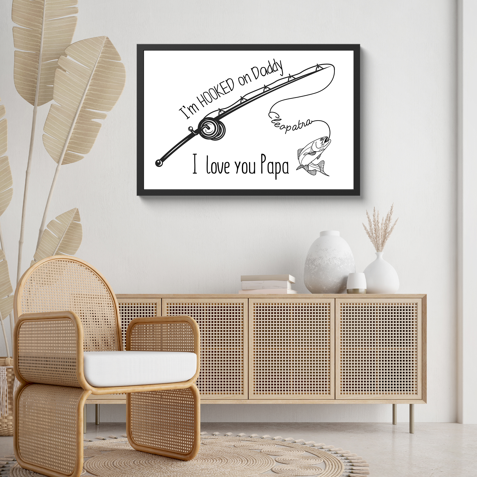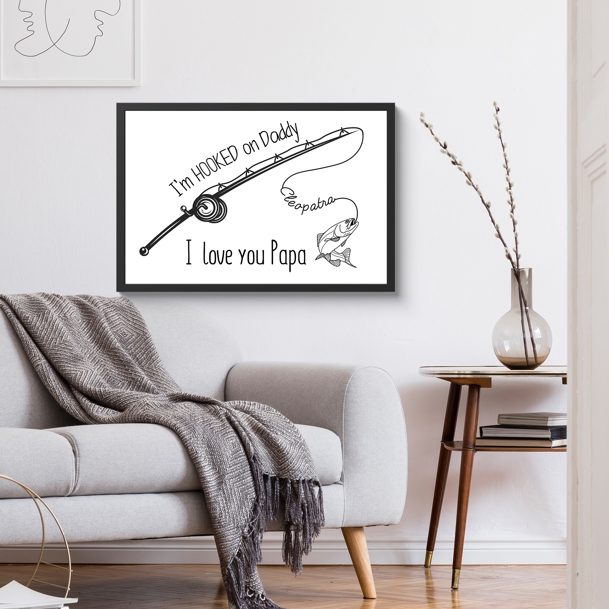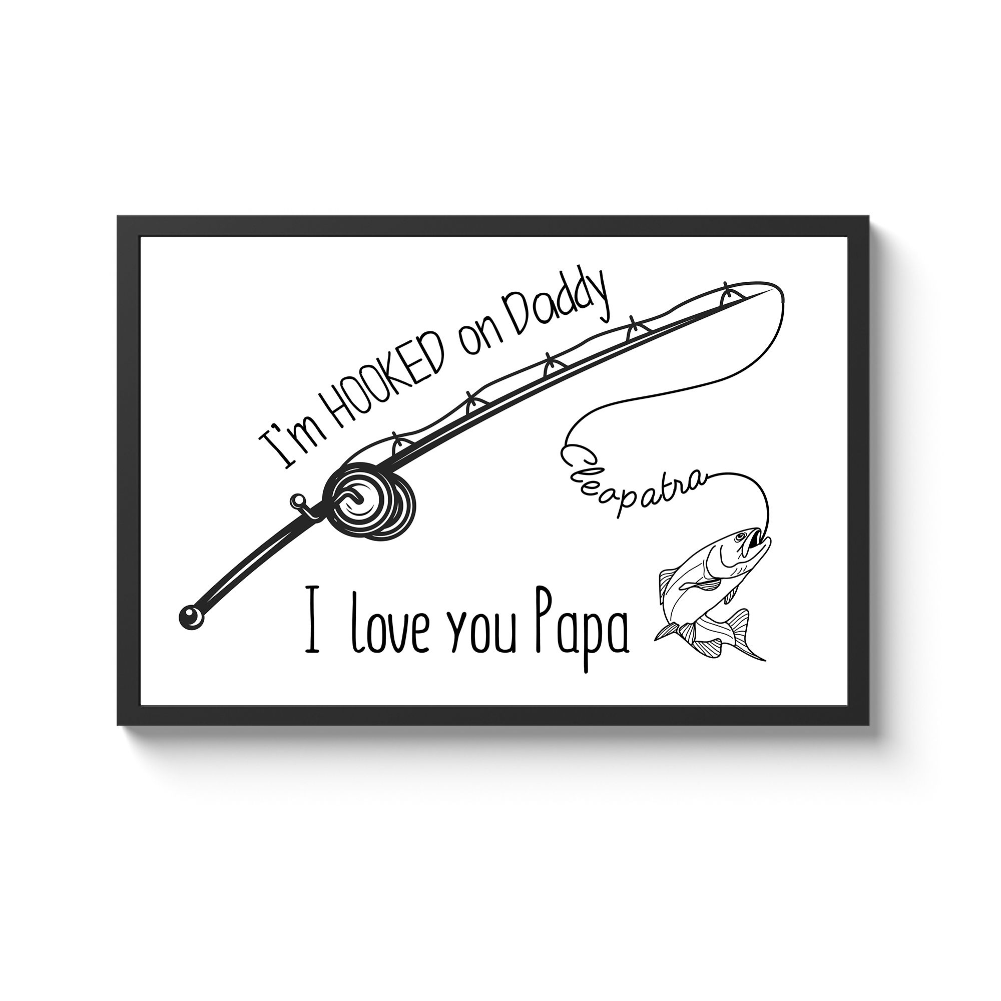Elevate your home decor with a touch of sentimental charm with our “I’m Hooked On Daddy Custom Name Framed Print.” This framed masterpiece features a captivating black line art illustration against a clean white background, focusing on a gracefully curved fishing rod. Express your affection with the handwritten-style text declaring “I’m HOOKED on Daddy” and reinforce the sentiment with the bold proclamation “I love you Papa” just below. Personalize this framed print with a name along the fishing line, turning it into a cherished tribute that captures the essence of a child’s admiration for their fishing-loving dad. Perfect for adorning your walls, this framed print is a thoughtful and timeless gift that seamlessly blends artistry with heartfelt sentiments.