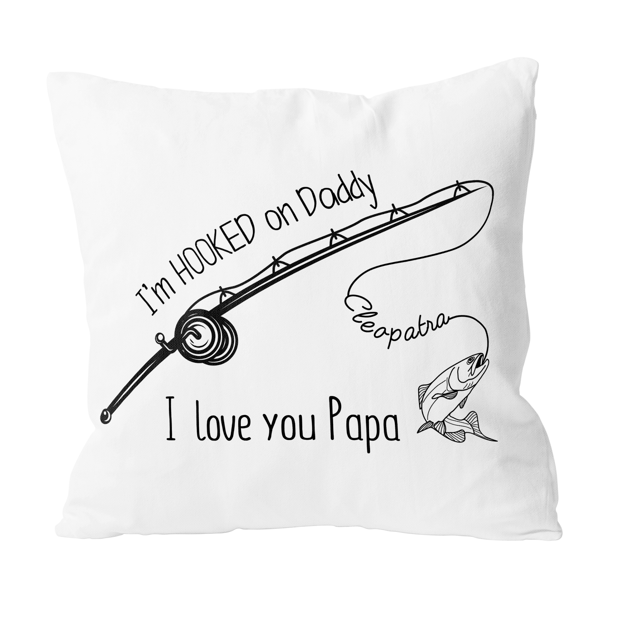 Cuddle up in style with our I’m Hooked On Daddy Custom Pillow – a cozy and personalized expression of love for your fishing enthusiast father. This custom pillow features a delightful black line art illustration on a white background, showcasing a beautifully curved fishing rod. The handwritten-style declaration “I’m HOOKED on Daddy” adds a touch of sentiment, while the bold proclamation “I love you Papa” reinforces the affectionate message. Personalize it further by adding a name along the curved fishing line. This custom pillow is not just a comfy accessory but a meaningful reminder of the special bond between a child and their fishing-loving dad. Give the gift of warmth and love this season with this unique and personalized pillow