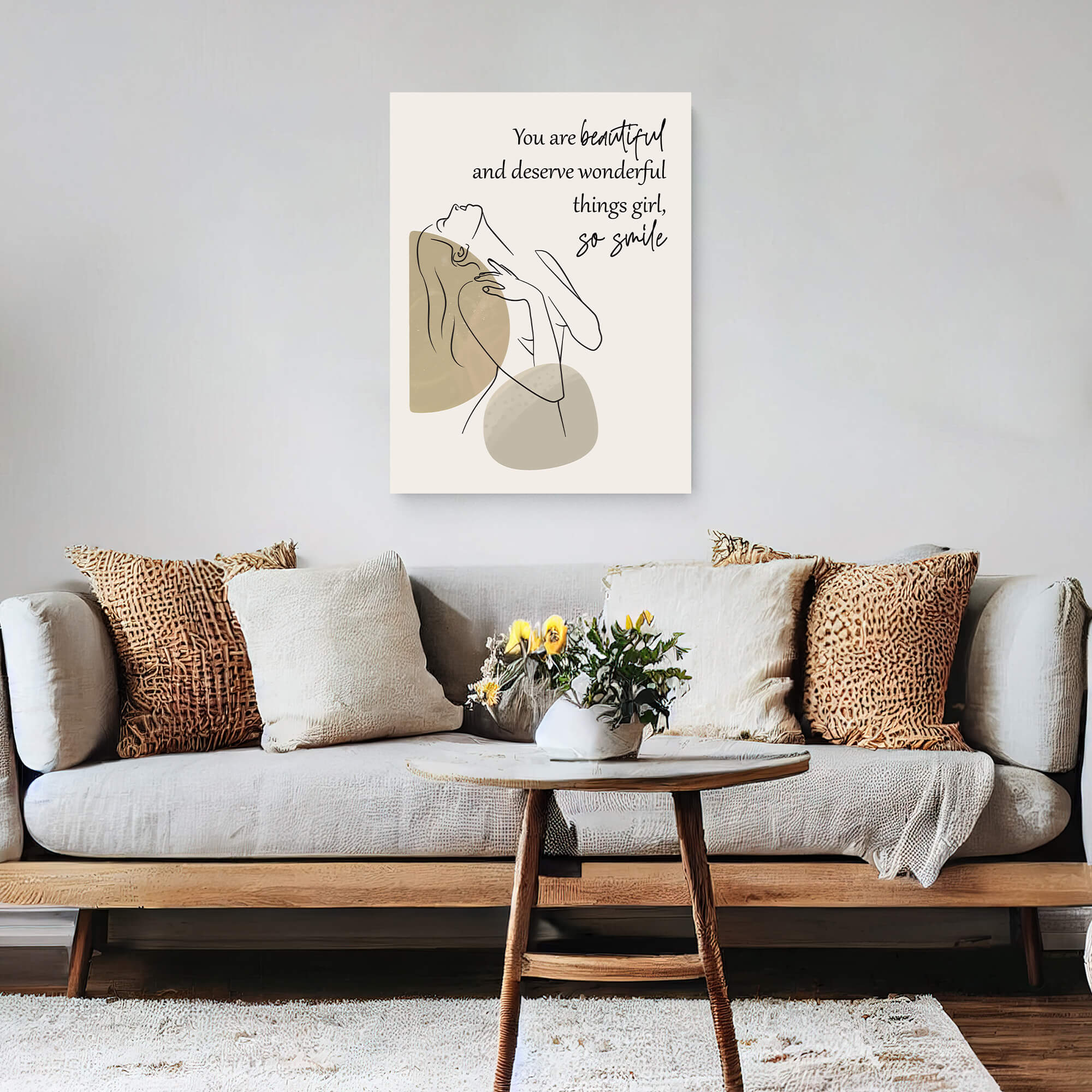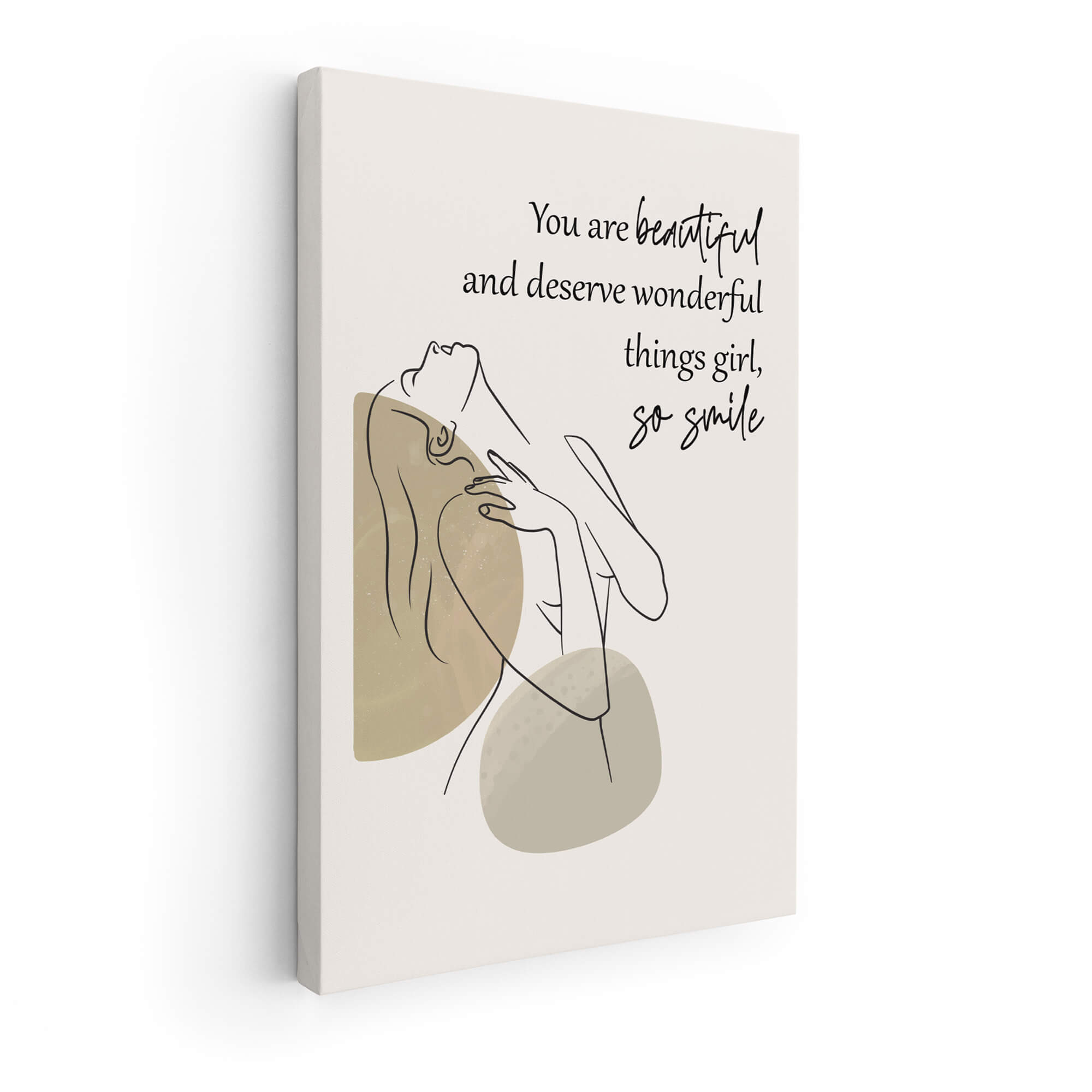 Introducing our Lovely Custom Quote Canvas Print, a heartfelt gift designed to celebrate the strength and beauty of every woman. This exquisite canvas features an elegant line drawing of a confident woman, gracefully portrayed against a soft and neutral background. With her head tilted back in a pose of unwavering confidence, she embodies the essence of femininity and inner strength. The neutral tones of beige and brown not only complement any room decor but also evoke a sense of tranquility and calmness. You can also change the color if you want. Whether displayed in a bedroom, living room, or office space, this canvas adds a touch of sophistication and inspiration to any environment.