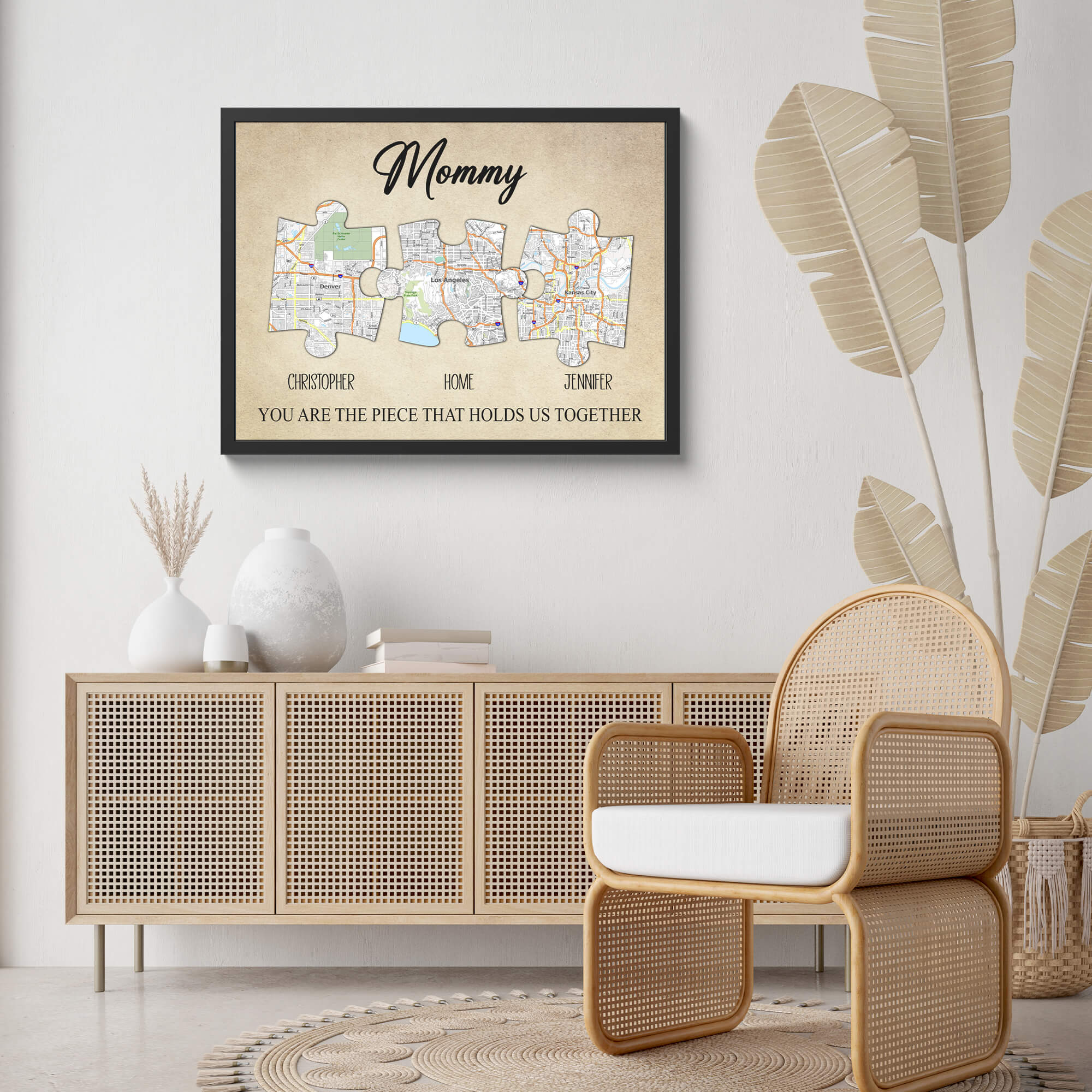 Elevate your home decor with our “Family Cartography” Mom You Are The Piece That Holds Us Together Custom Framed Print—a stunning representation of the unbreakable bonds between mother, daughter, and son. This unique ensemble is not just art; it’s a heartfelt testament to family ties, perfect for birthdays, Mother’s Day, or any occasion that calls for a meaningful expression of love. Printed with precision, the vibrant colors and sharp details come to life within the frames, creating a captivating display that will be a cherished focal point in any room. Choose the perfect custom size, and rest assured that this personalized framed print will arrive with care, ready to make a statement of enduring love and appreciation.