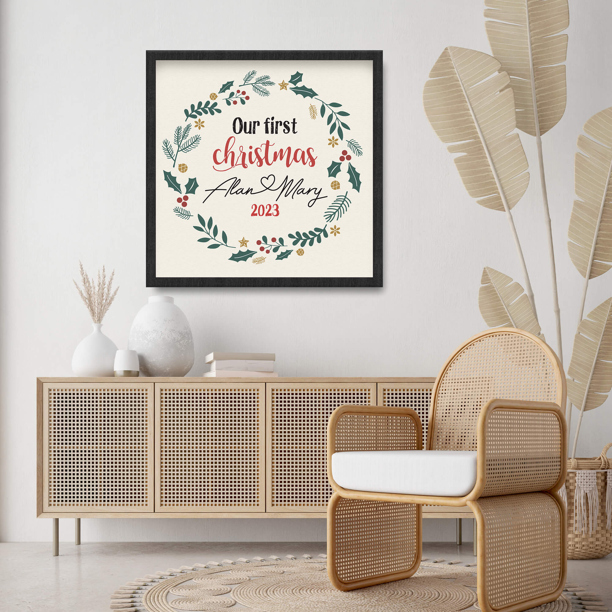 Elevate your festive decor with our Our First Christmas Newlywed Personalized Framed Print. This beautifully crafted framed print showcases the significance of your first Christmas as a married couple, with the addition of your names for a personal touch. Encased in a high-quality frame, this keepsake not only radiates holiday charm but also becomes a stylish and sentimental addition to your home. Perfect for gifting or displaying in your own space, this framed print encapsulates the joy of the season and the beginning of your shared traditions.