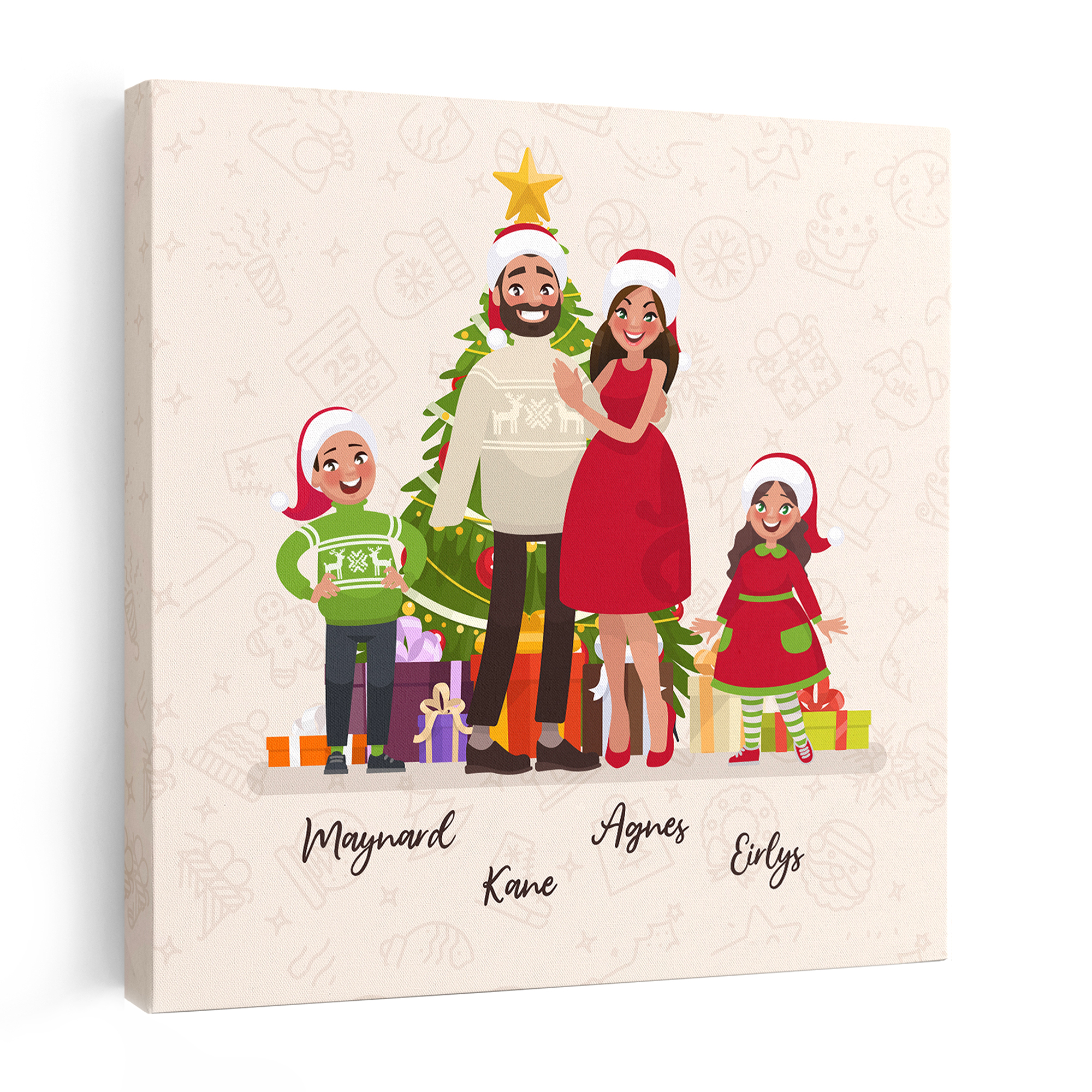 Infuse your home with the heartwarming charm of our “Personalized Family Members Name Cute Canvas Print.” This product is a beautiful canvas print that features a family of four with their names written below. It is a perfect gift for the holidays or any occasion to show your love and appreciation for your family. The canvas print is made of high-quality material and has a festive design with a Christmas tree and holiday-themed illustrations. You can customize the print with the names of your family members and choose from different sizes and colors. This product is a great way to decorate your home or office with a personal touch and a cute reminder of your family.