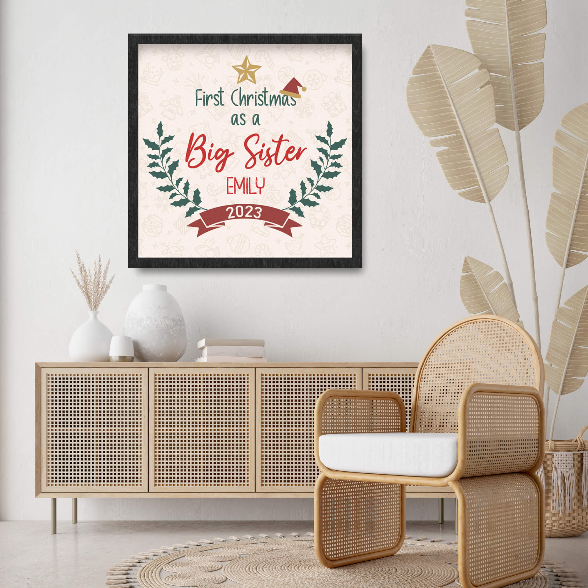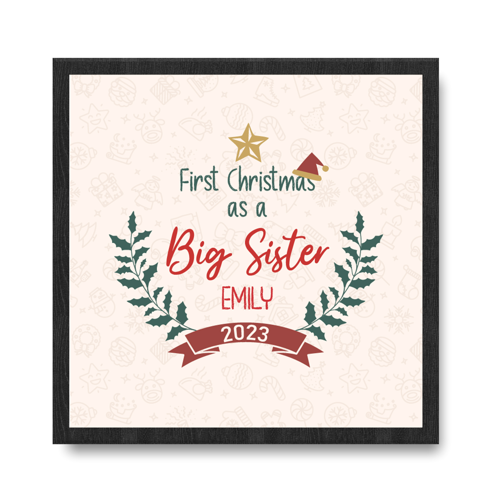 Crafted with precision, this framed print allows you to customize the girl’s name and the year of the first Christmas. The high-quality material ensures durability, and the glossy finish adds a touch of sophistication. Hung proudly on your wall, this framed print becomes a visual celebration of the first Christmas as a big sister—a perfect blend of sentiment and style.