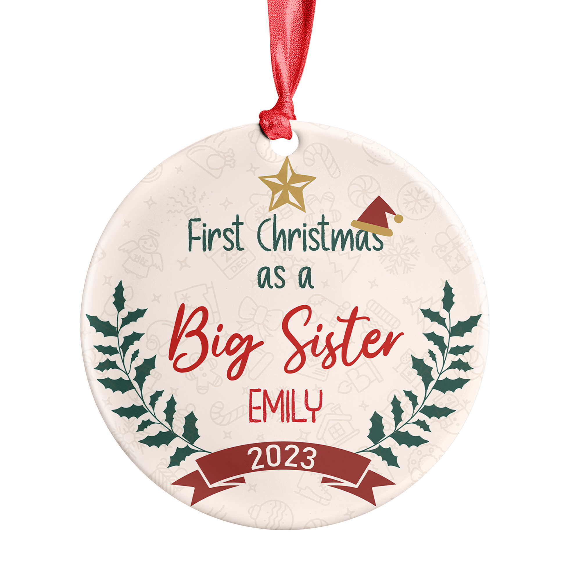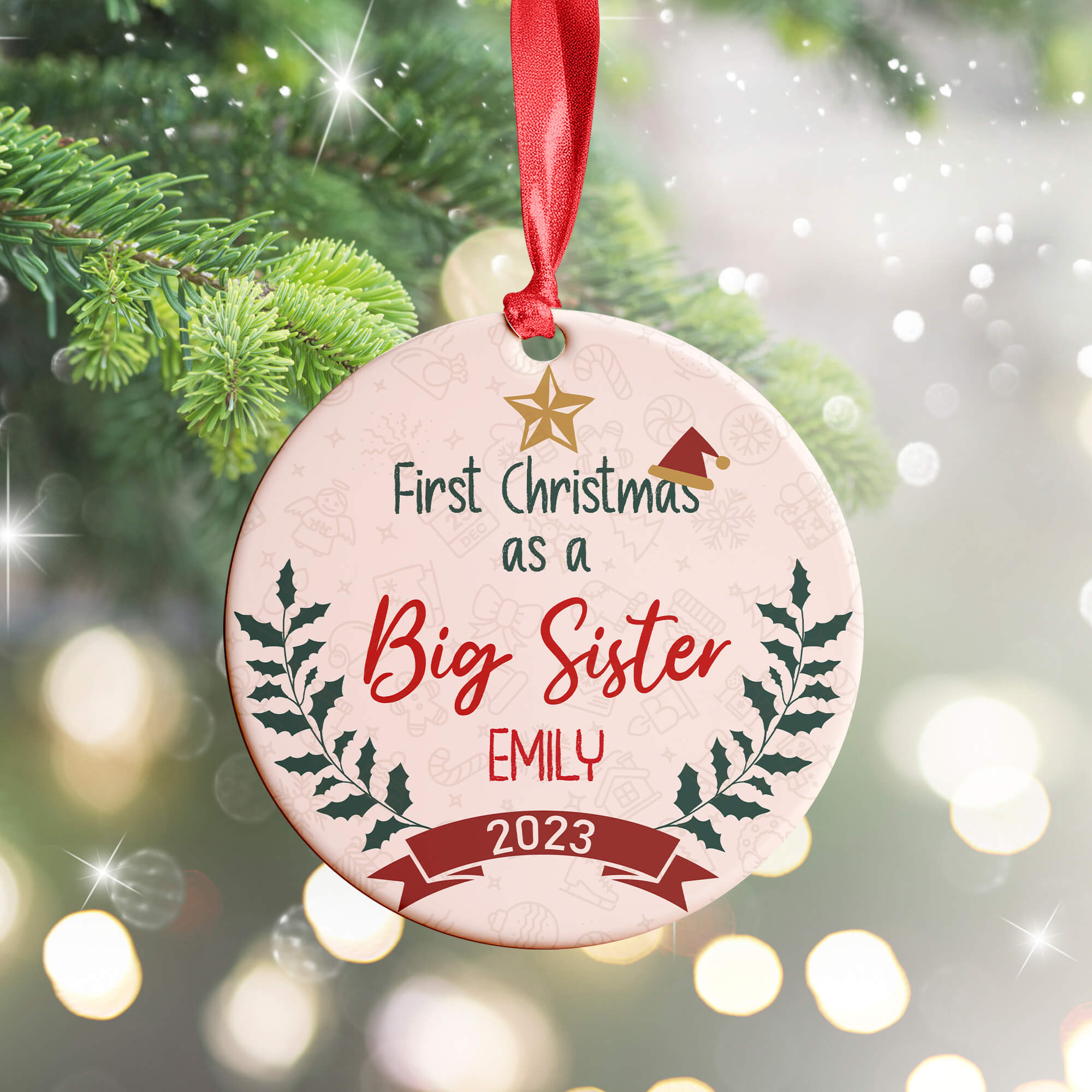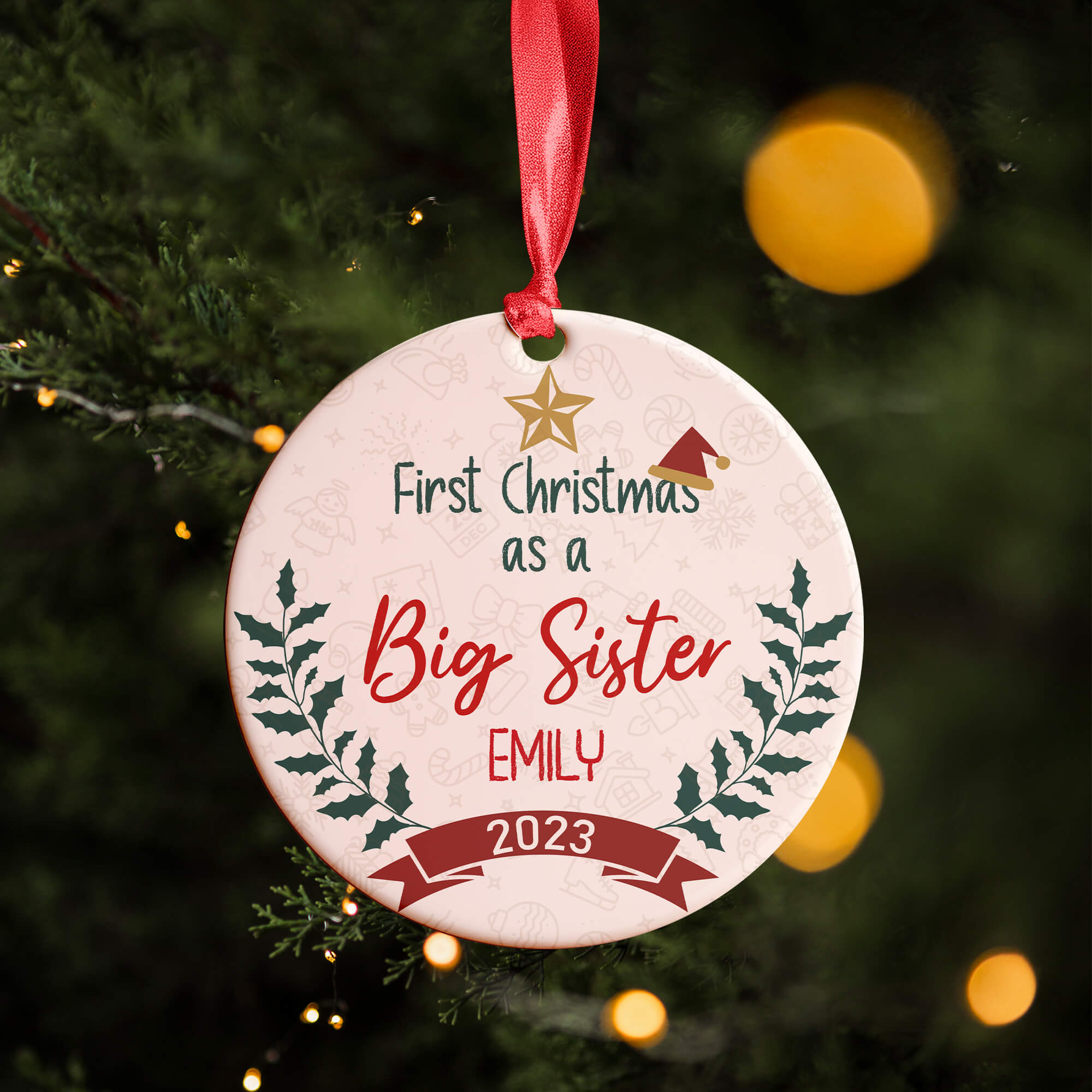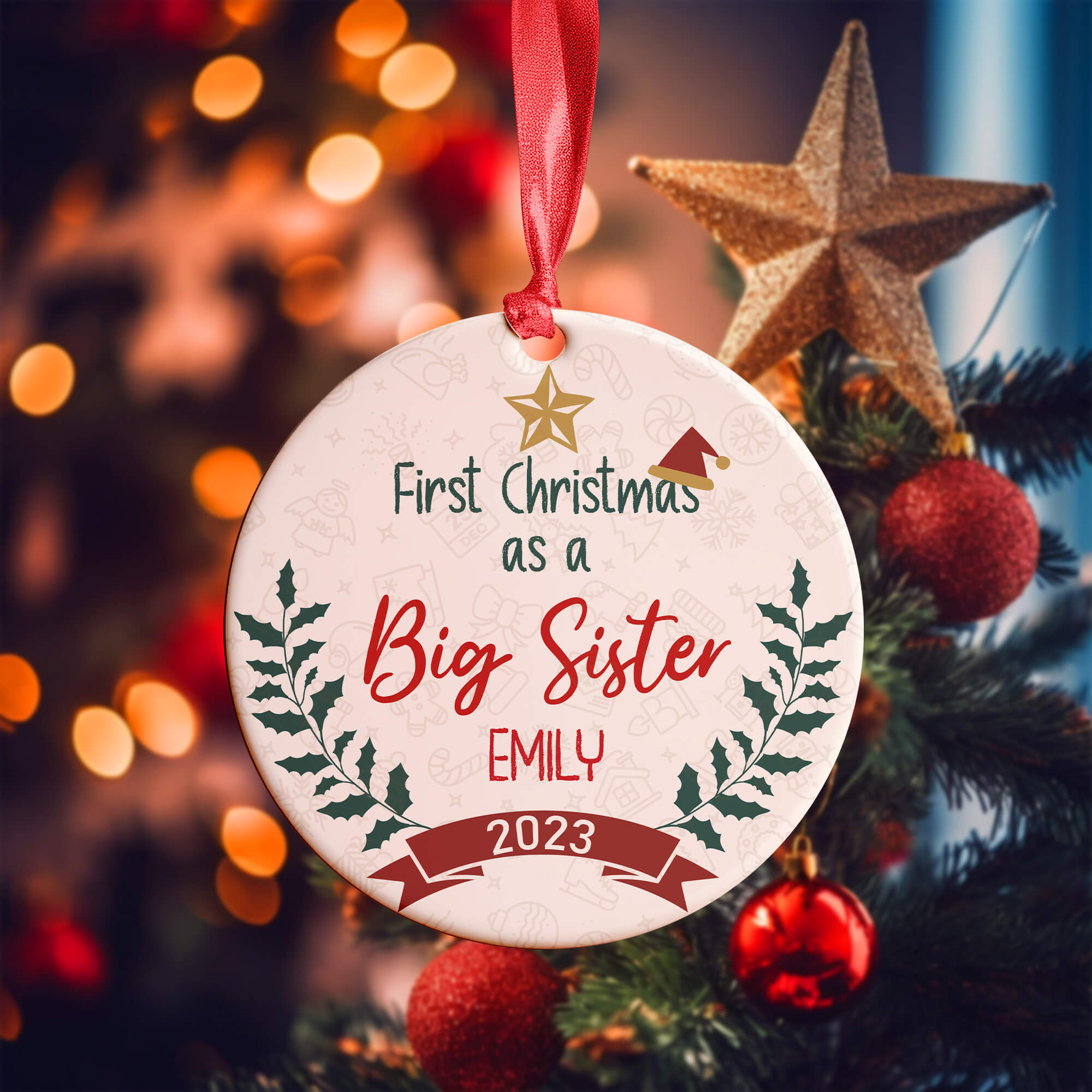 Despite its reasonable price, this ornament reflects high-quality craftsmanship, ensuring a lasting and visually appealing decoration that resonates with the warmth of shared moments. Adorn your tree with this symbol of newfound siblinghood, or gift it to a little one embracing their first Christmas as a big sister. Let this personalized Christmas ornament be a sparkling reminder of the joyous beginning of a lifetime of shared holiday memories in their role as a loving big sister.