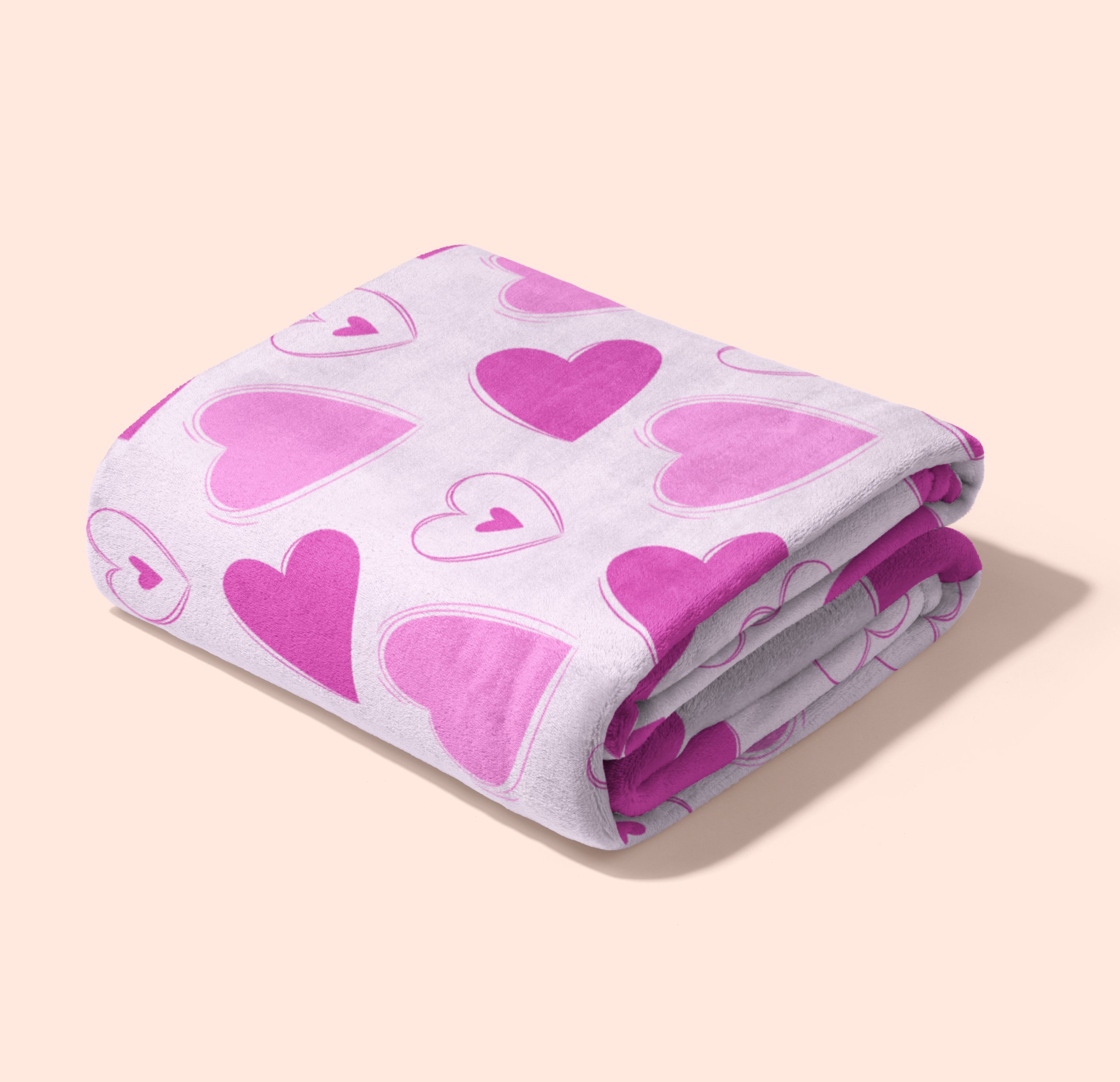 Introducing our Personalized Heart Blanket Romantic Gift—an enchanting expression of love designed to wrap your cherished moments in warmth and sentiment. This luxurious blanket features a soothing light purple backdrop adorned with an array of pink hearts, creating a visual symphony of romance that will captivate the heart of your beloved.