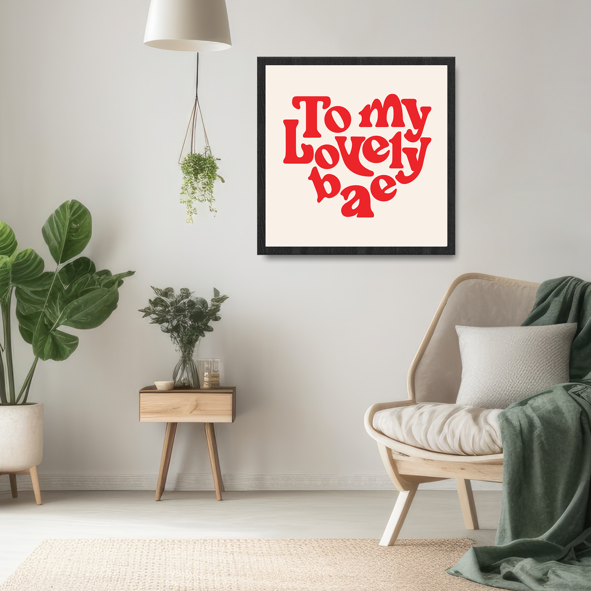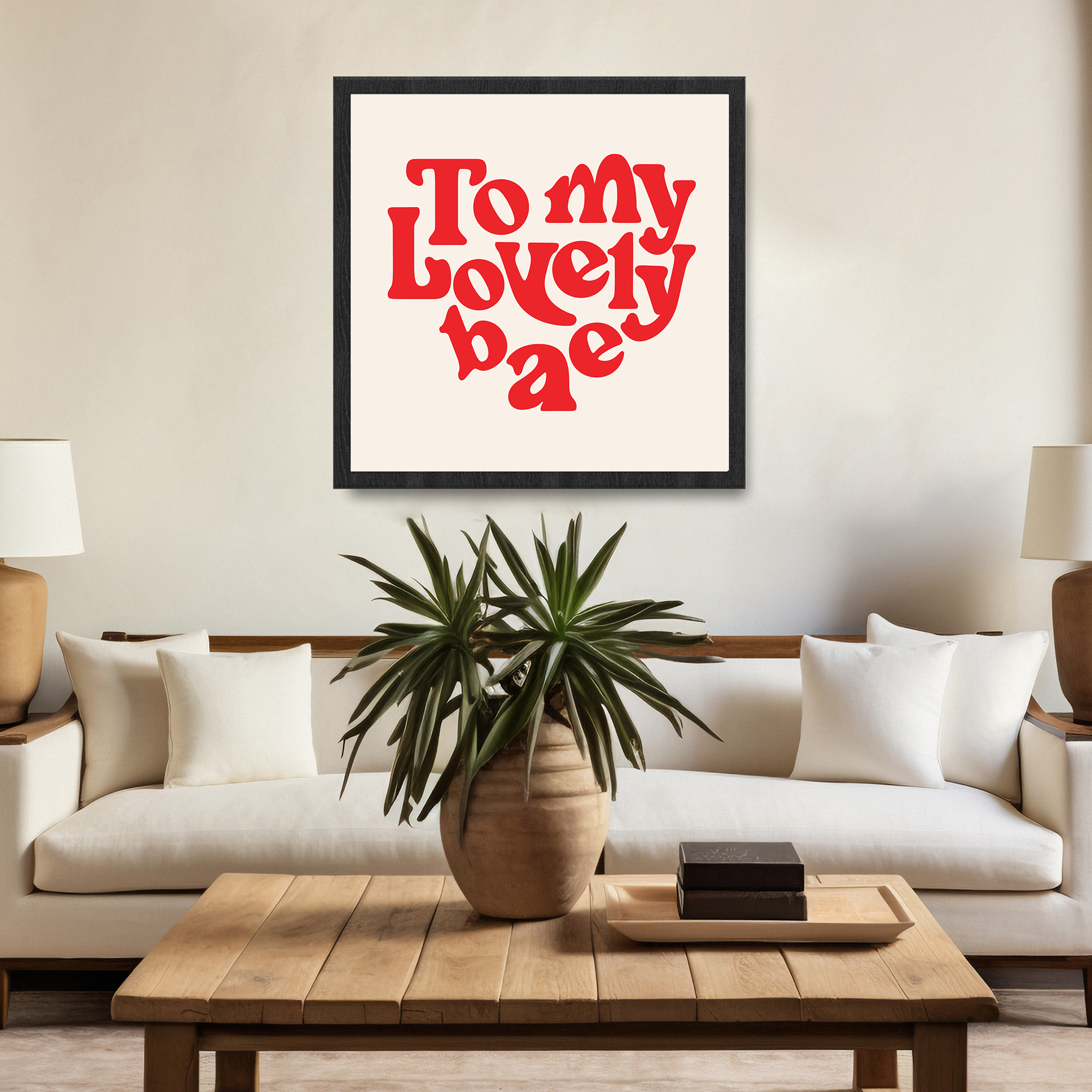 Embrace the warmth of your affection with our Personalized Love Message To My Lovely Bae Framed Print. This charming square print features a clean and classic design, with the heartfelt message “To my Lovely bae” elegantly rendered in bold, red letters against a crisp white background. Encased in a stylish frame, this framed print adds a touch of sophistication to any space. The ability to personalize your unique expressions of love makes it a meaningful and romantic gift, perfect for anniversaries, birthdays, or to celebrate the special bond you share with your beloved.💝