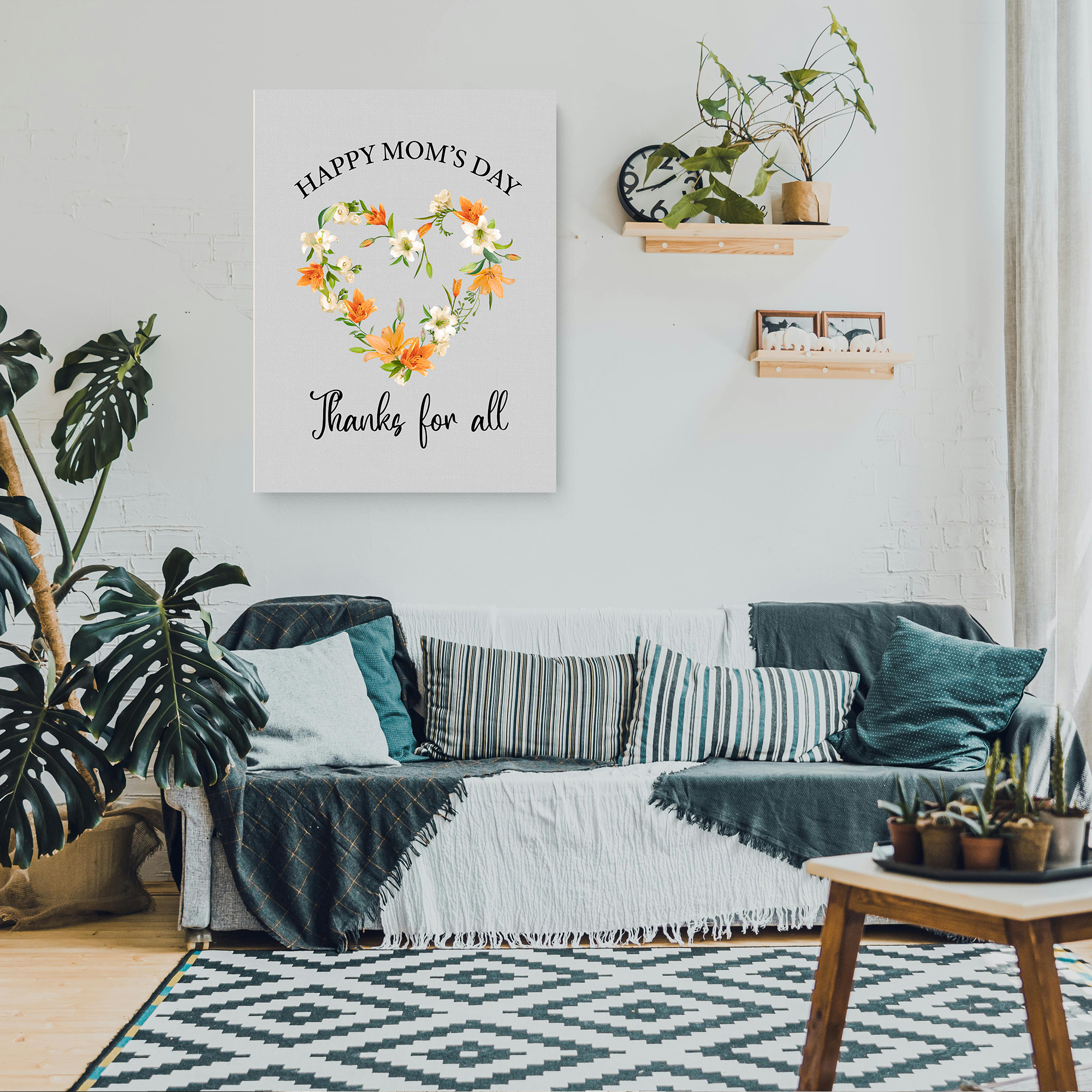 At the top of the canvas, in an elegant cursive font, the phrase “Happy Mom’s Day” adorns the upper part, serving as a joyful greeting to celebrate the occasion. Just below the floral heart, another cursive text reads “Thanks for all,” providing a heartfelt expression of gratitude. This text is fully customizable, allowing you to convey your personalized message that resonates with your relationship with your mother.