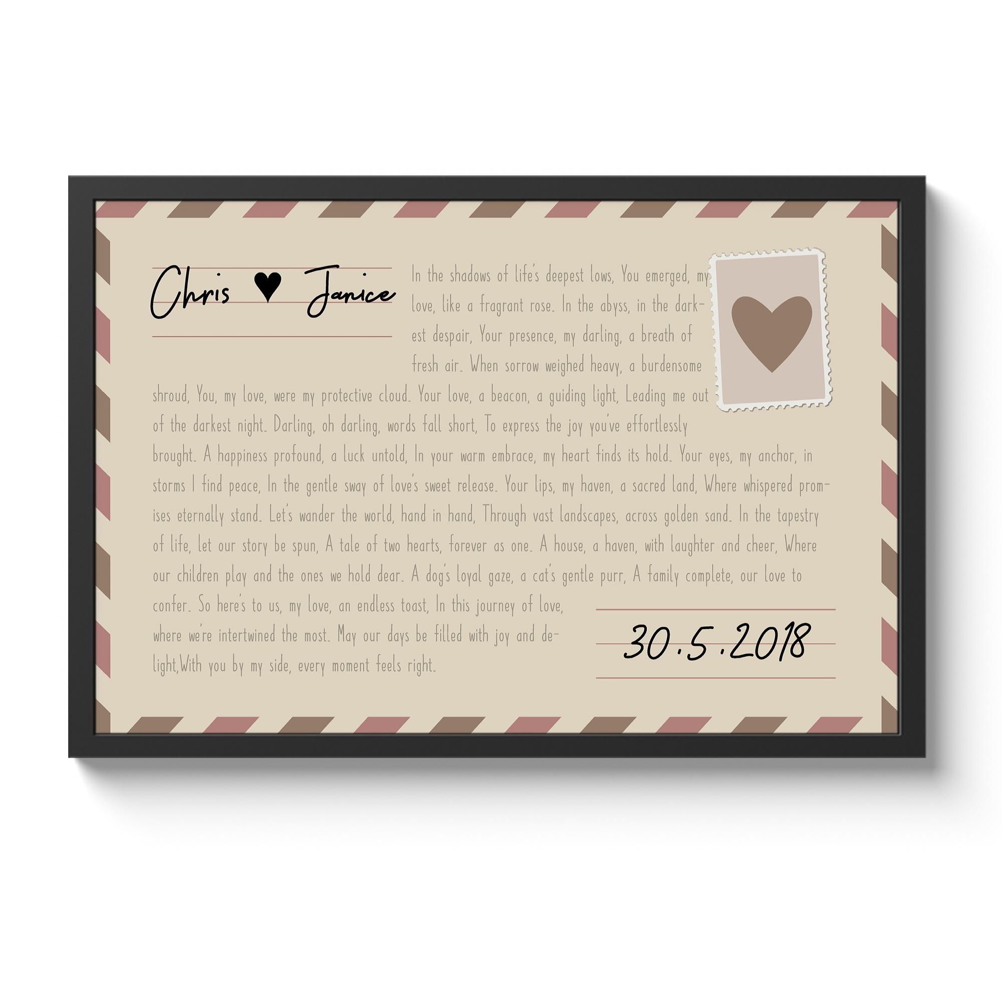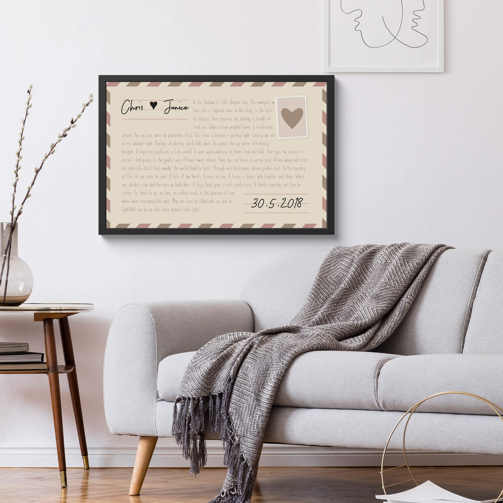 Immortalize your favorite song in a visual symphony with the Song Lyric Gifts Custom Framed Prints With Song Name. This framed masterpiece intertwines the lyrics of your cherished song with its romantic name, creating a timeless work of art. Crafted with precision and care, this personalized framed print celebrates anniversaries, milestones, or any special occasion with a sentimental narrative in both words and letter form. Vibrant colors, sharp details, and an enduring aesthetic characterize this budget-friendly yet elegant piece, making framed print a perfect addition to your home decor.