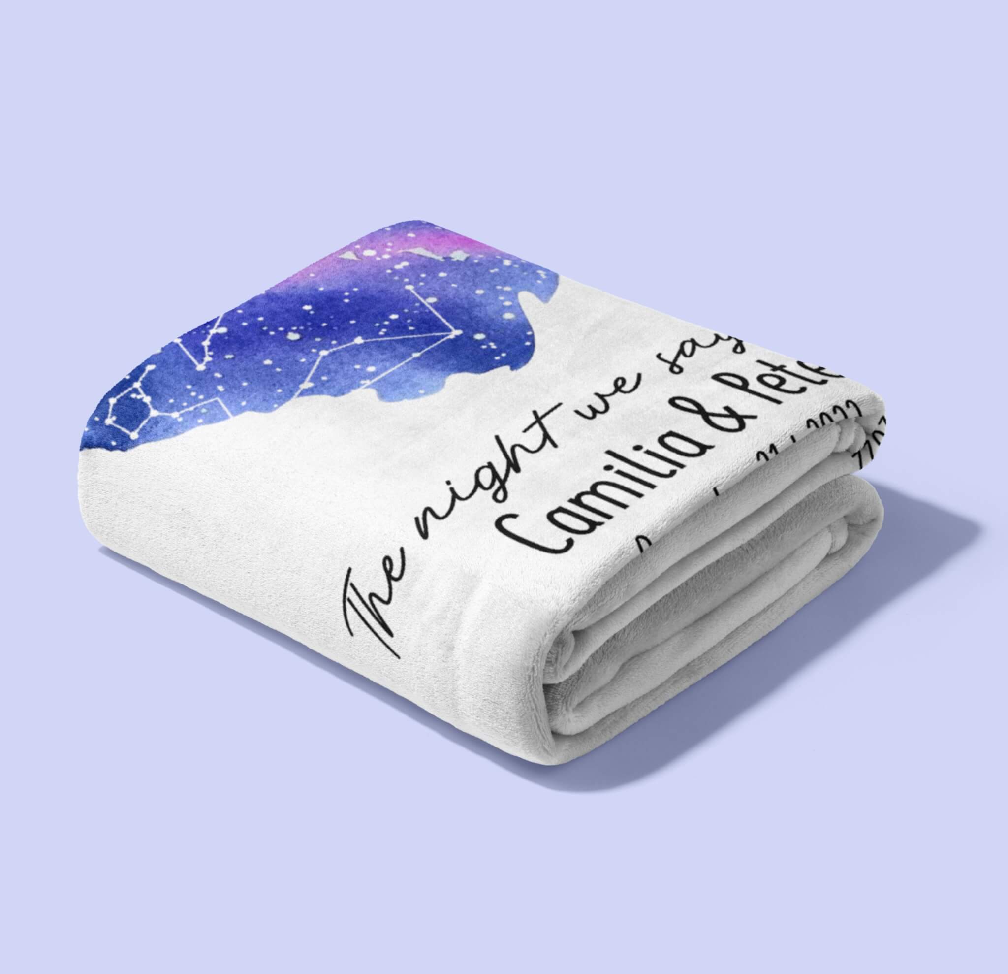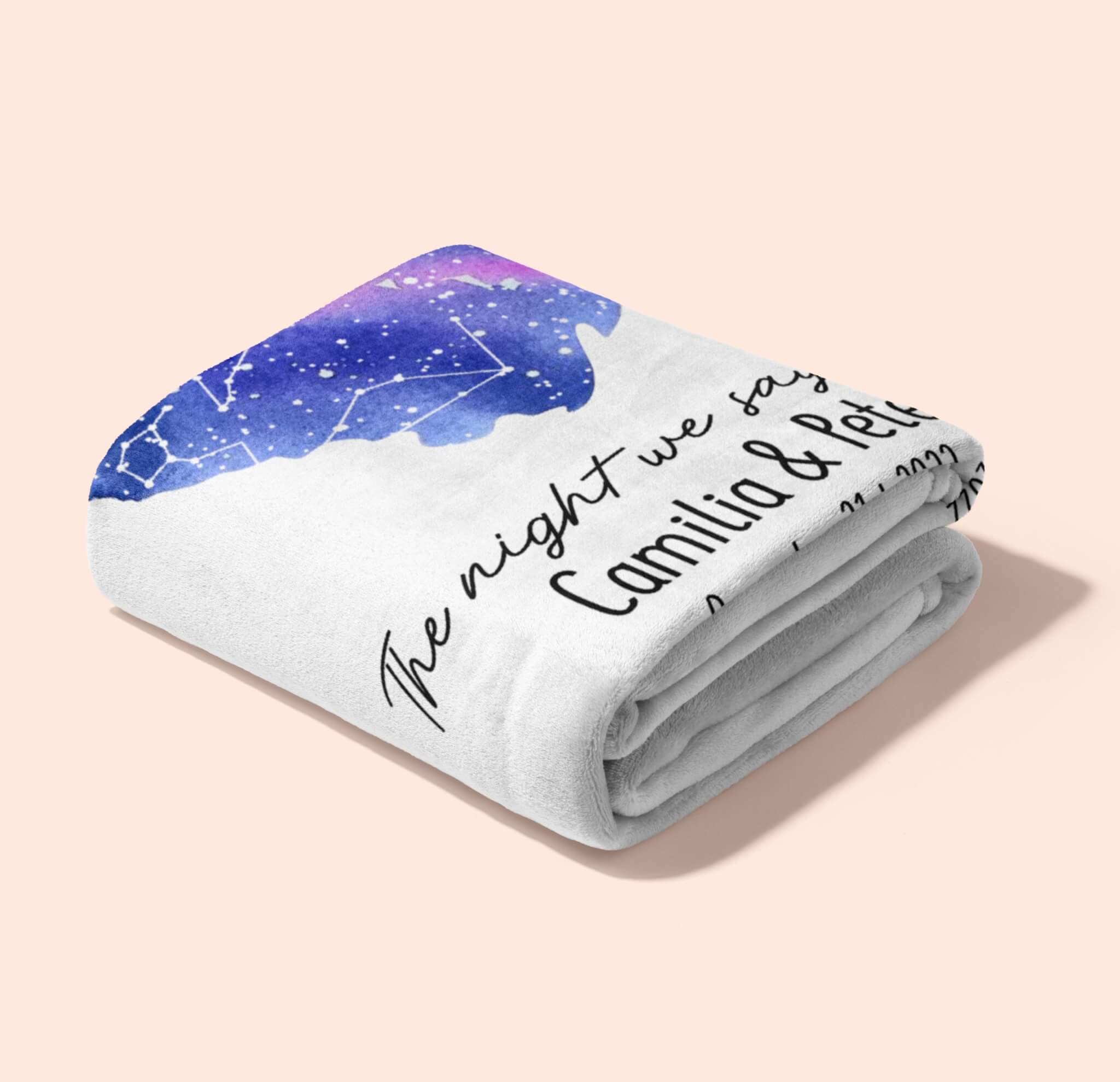 Wrap yourself in the warmth of love with “The Night We Say I Do” Custom Blanket. This cozy and personalized blanket is adorned with a celestial masterpiece, a starry sky intricately arranged in the shape of a watercolor heart. The soft, high-quality fabric ensures both comfort and durability, making it an ideal companion for chilly nights and heartfelt moments. Whether you’re cuddling up on the couch or adding a romantic touch to your bedroom, this custom blanket is a tangible reminder of the night your love story took center stage.