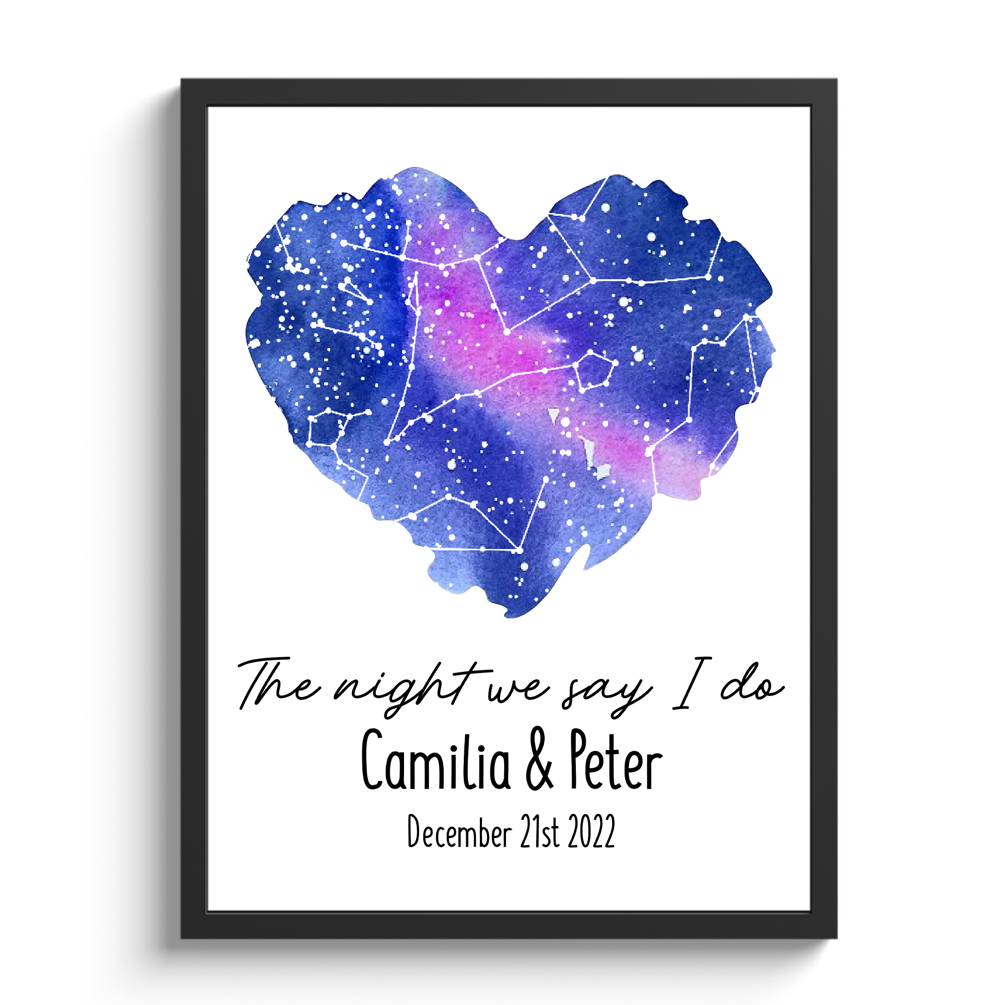 Immerse yourself in the enchanting memories of that special night with The Night We Say I Do Custom Framed Print. This elegantly framed masterpiece showcases a personalized starry sky, intricately designed in the form of a watercolor heart, capturing the magical moment you both pledged your love. The museum-quality framing ensures durability and adds a touch of sophistication, making the framed print a timeless piece that not only commemorates your cherished day but also becomes a stunning focal point in any space.