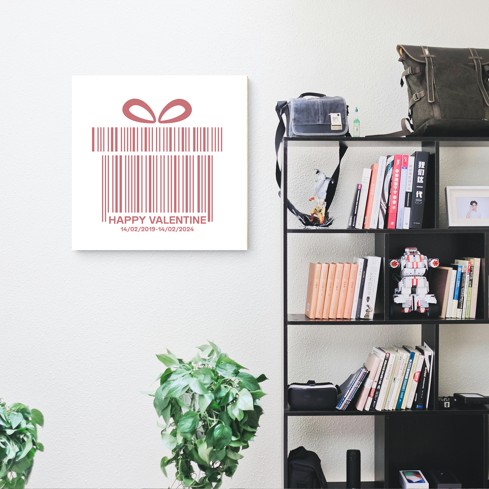 The canvas features a pristine white background adorned with a meticulously printed design. At the heart of the artwork is a striking barcode, intricately crafted to take the form of a charming gift box. The barcode design, comprised of vibrant red vertical bars, creates a visually captivating pattern that symbolizes the uniqueness of your relationship.