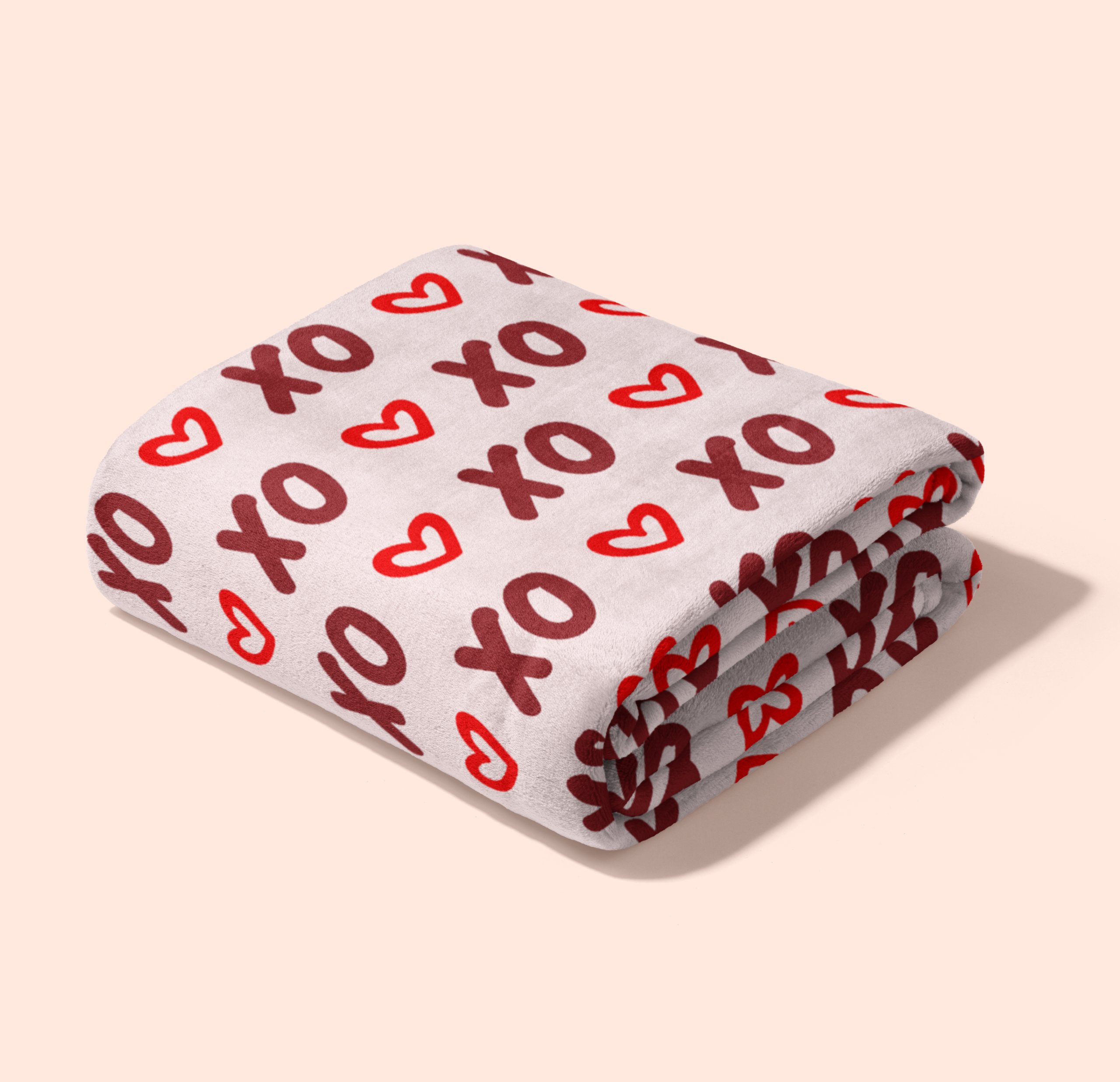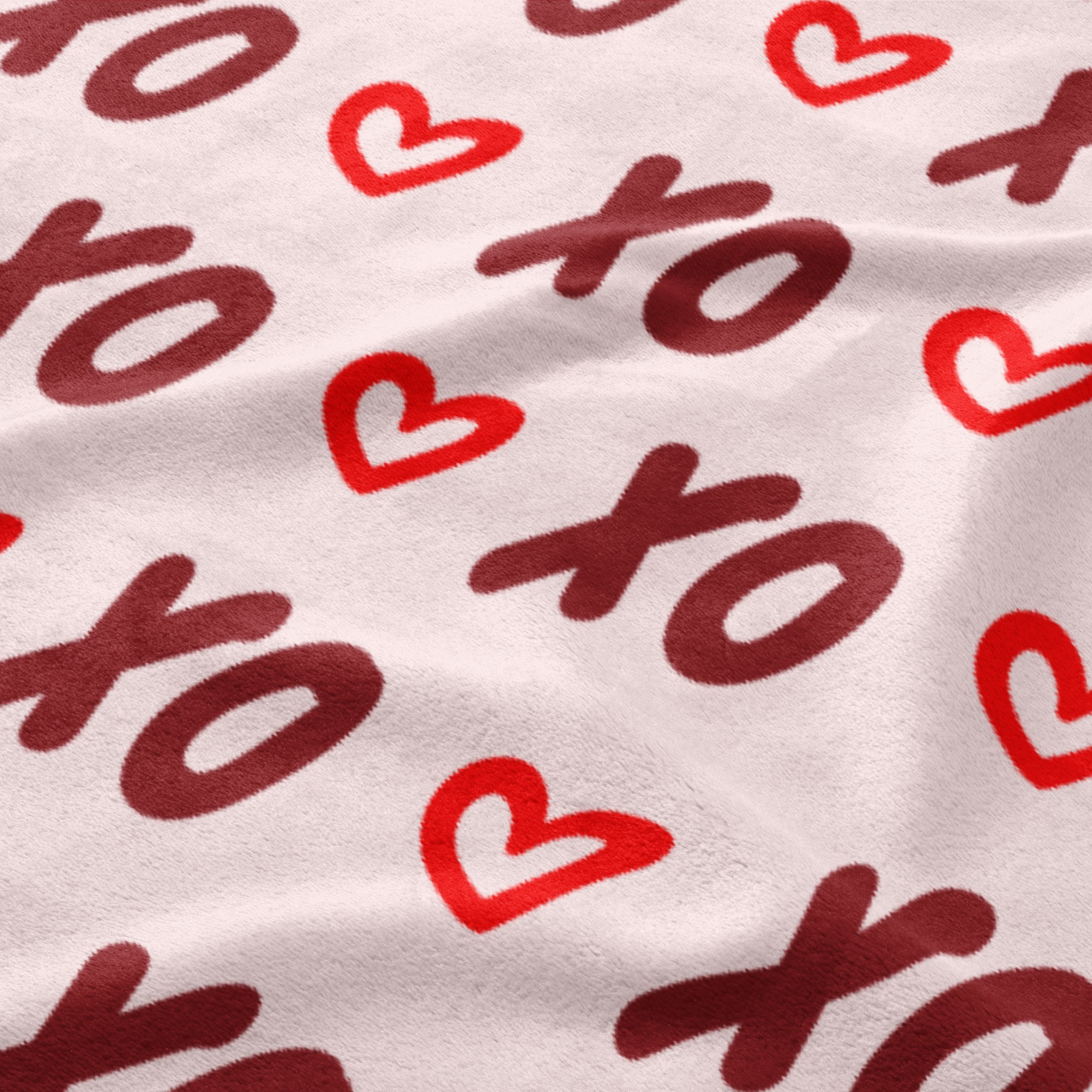 The blanket showcases a charming repetitive pattern of “XO” and heart shapes in a vibrant shade of red against a soft, light background. Crafted from fleece fabric, this blanket is not just a visual treat but also promises a luxurious feel. The soft material ensures warmth and comfort, making it an ideal companion for cuddling up with your loved one on chilly evenings.